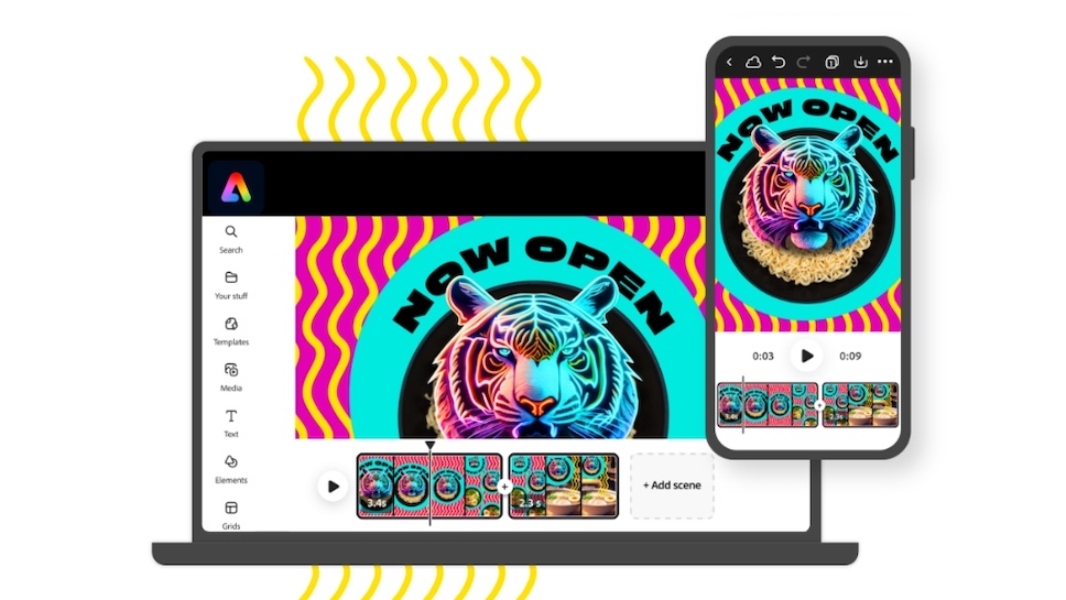 นอกจากนี้ Adobe Express ยังสามารถตัดต่อวิดีโอได้อย่างรวดเร็วและง่ายดาย ช่วยให้ผู้ใช้งานสามารถรวมคลิปวิดีโอ รูปภาพ และเพลง เพิ่มภาพเคลื่อนไหว หรือแม้แต่คำบรรยายแบบเรียลไทม์ รองรับกว่า 100 ภาษา เพื่อสร้างคลิปสำหรับการแชร์บนแพลตฟอร์มโซเชียลมีเดีย และสำหรับสมาชิก Creative Cloud ยังสามารถดึงเนื้อหาจาก Photoshop และ Illustrator ได้โดยตรงภายในแอป Adobe Express