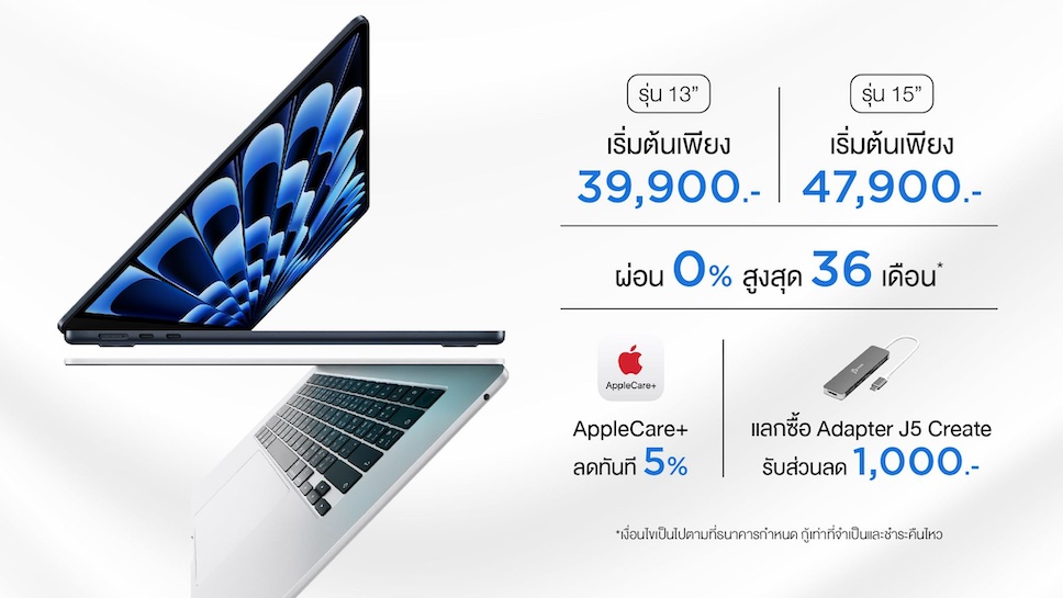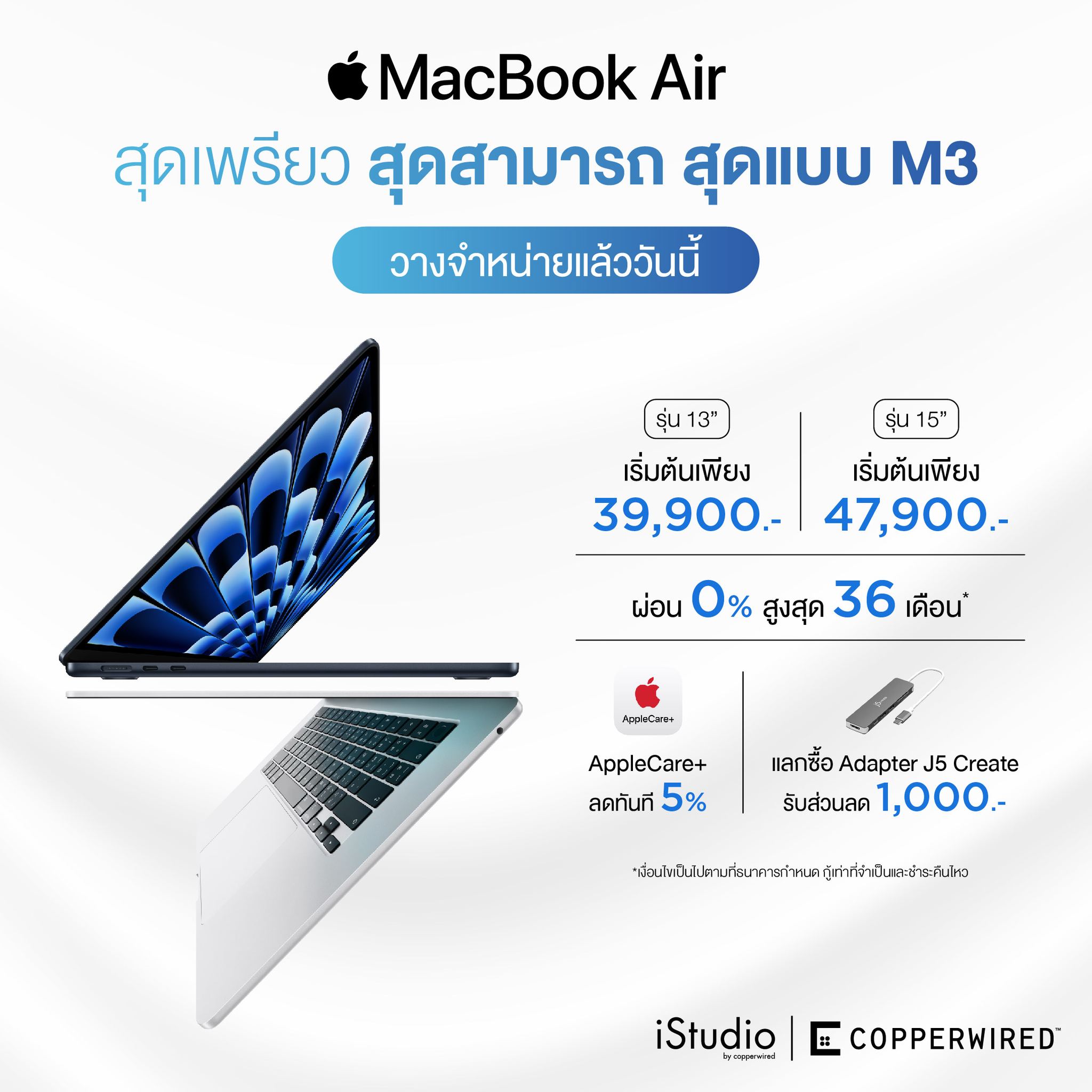 สำหรับผู้ที่สั่งซื้อ MacBook Air รุ่นชิป M3 ผ่านทาง iStudio by copperwired ยังมีสิทธิ์รับส่วนลดทันที 5% เมื่อซื้อ AppleCare+ และรับส่วนลดทันที 1,000 บาท สำหรับแลกซื้อ Adapter J5 Create