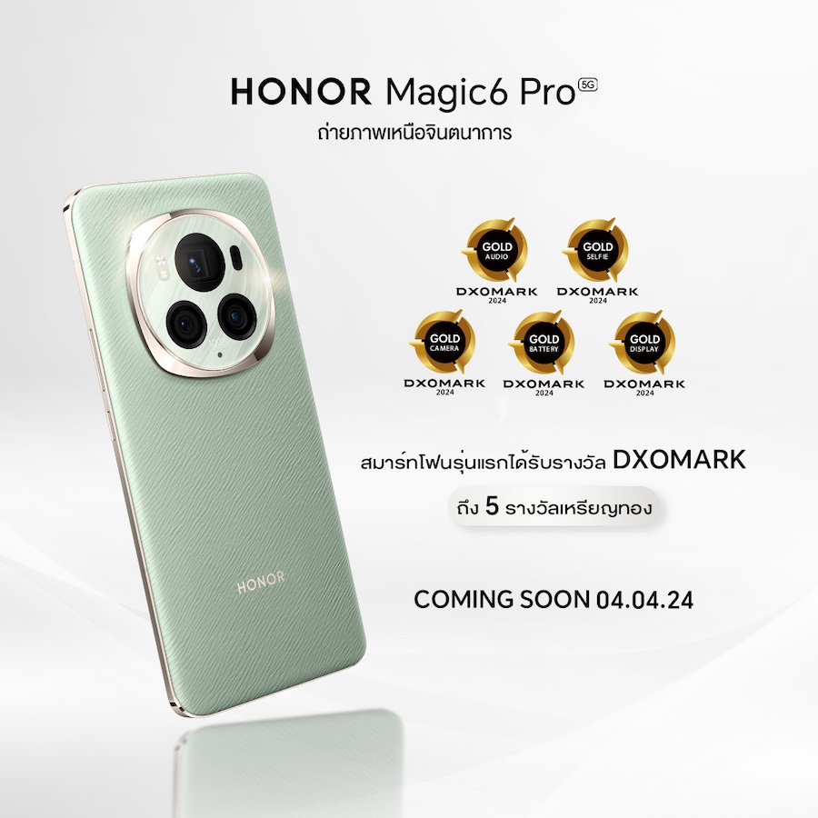 HONOR Magic6 Pro มาในคอนเซ็ปต์ “ถ่ายภาพเหนือจินตนาการ” โดยเป็นสมาร์ตโฟนรุ่นแรกที่ได้รับรางวัล DXOMARK ระดับเหรียญทองถึง 5 รางวัล รวมถึงอันดับ 1 ในฐานะสมาร์ตโฟนที่มีกล้องดีที่สุด จากการทดสอบโดย DXOMARK (ข้อมูลเมื่อวันที่ 21 มีนาคม 2567)