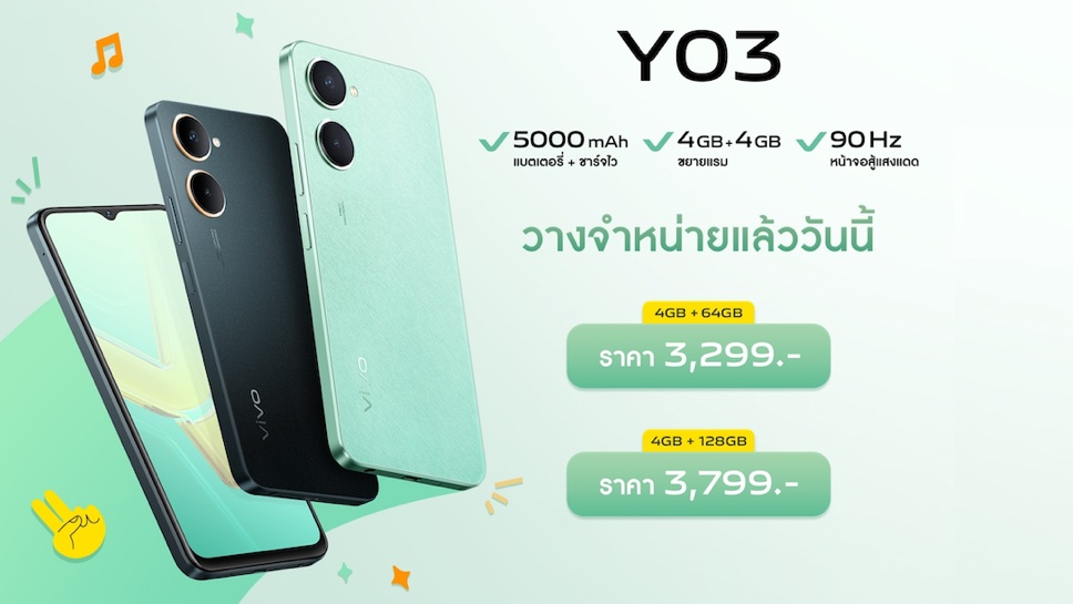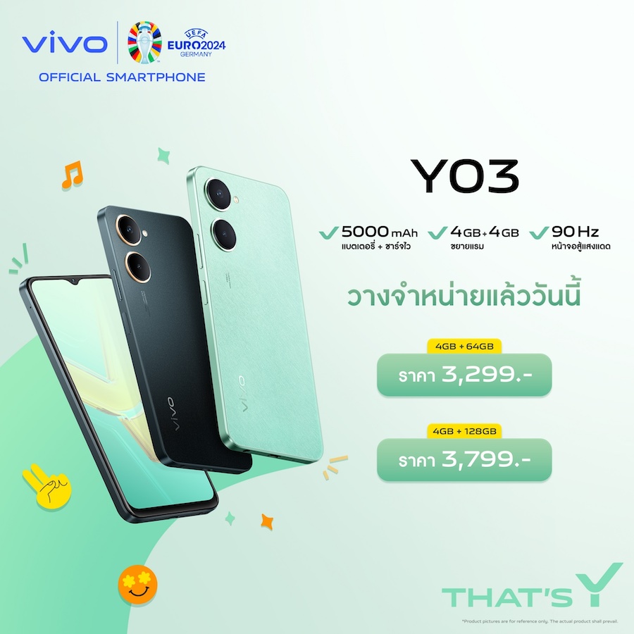 vivo พร้อมวางจำหน่ายสมาร์ตโฟน vivo Y03 อย่างทางการในไทยแล้ว ถือเป็นสมาร์ตโฟนระดับเริ่มต้น ที่มีความคุ้มค่าสุดๆ ด้วยค่าตัวเพียง 3,299 บาท สำหรับรุ่น RAM 4GB + ROM 64GB และอีกตัวเลือกราคา 3,799 บาท ได้รับ RAM 4GB + ROM 128GB
