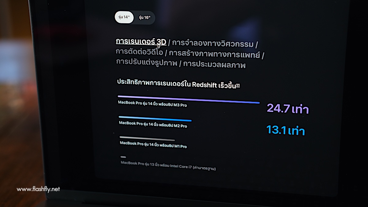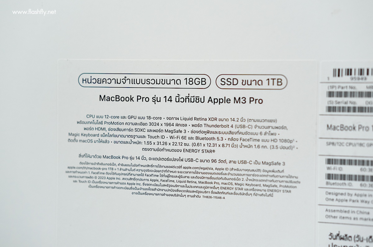 สำหรับ MacBook Pro รุ่น 14 นิ้ว ที่ทีมงาน @Flashfly ได้รับมารีวิว ใช้ชิป M3 Pro ประกอบด้วยทรานซิสเตอร์ 3.7 หมื่นล้านตัว ใช้ CPU แบบ 12-core (คอร์ด้านประสิทธิภาพ 6 คอร์ และคอร์ด้านประหยัดพลังงาน 6 คอร์ ) ให้ประสิทธิภาพเร็วขึ้นสูงสุด 40% เมื่อเทียบกับ MacBook Pro รุ่น 16 นิ้ว ที่ใช้ชิป M1 Pro
