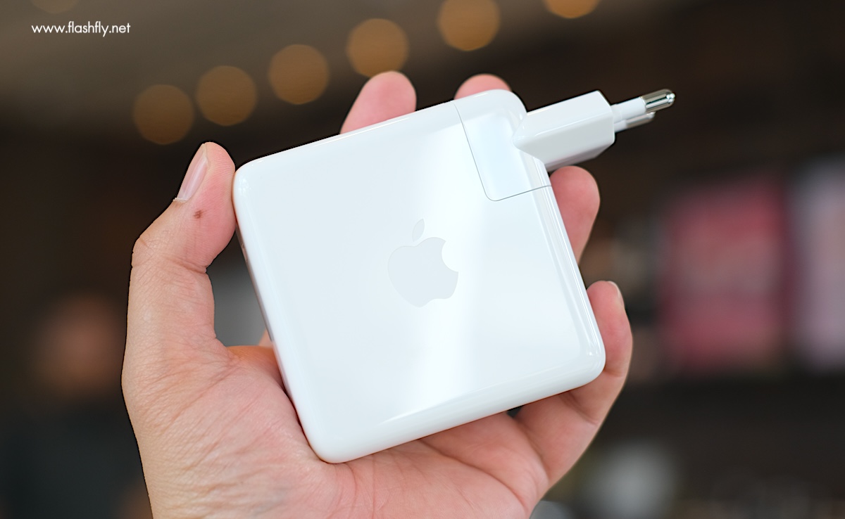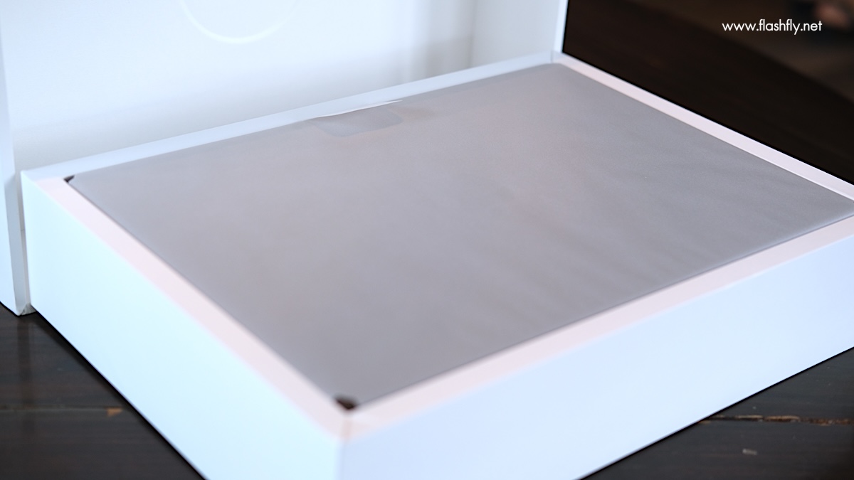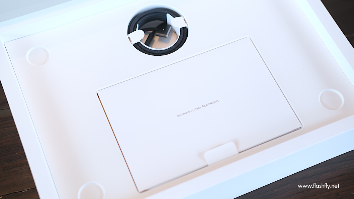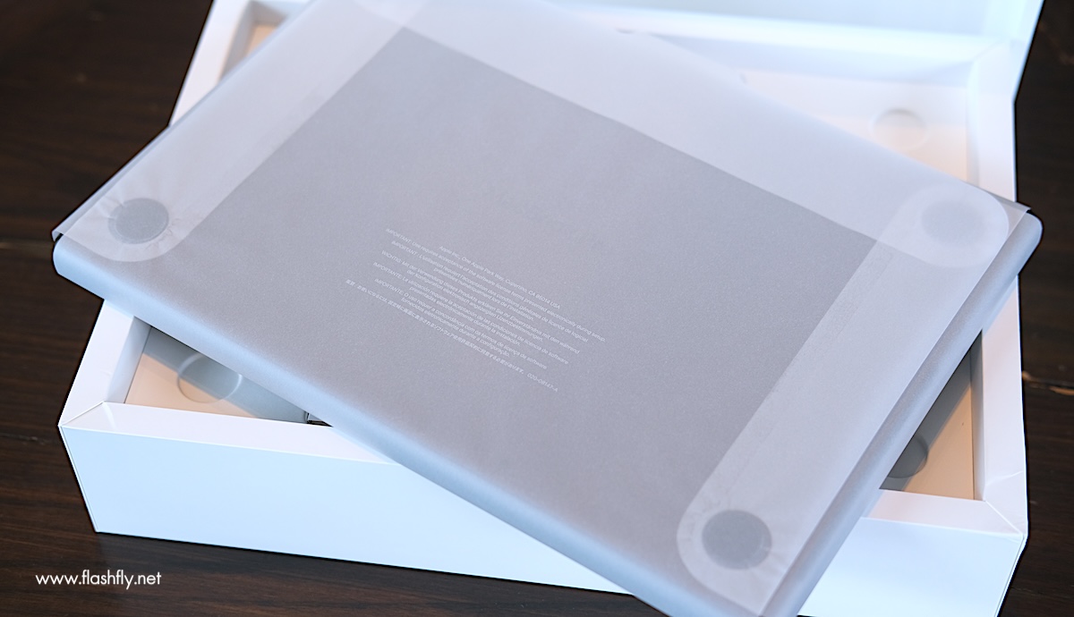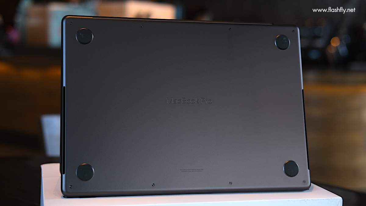 เมื่อพลิกมาดูที่ส่วนฐานหรือข้างใต้จะพบกับแผ่นยางติดตั้งไว้ตรงมุมทั้ง 4 ช่วยเพิ่มความมั่นคงในการวางบนพื้นราบ ตรงกลางจะมีคำว่า MacBook Pro ให้อีกด้วย ขณะที่รุ่น MacBook Air ไม่มี