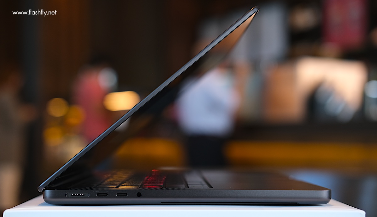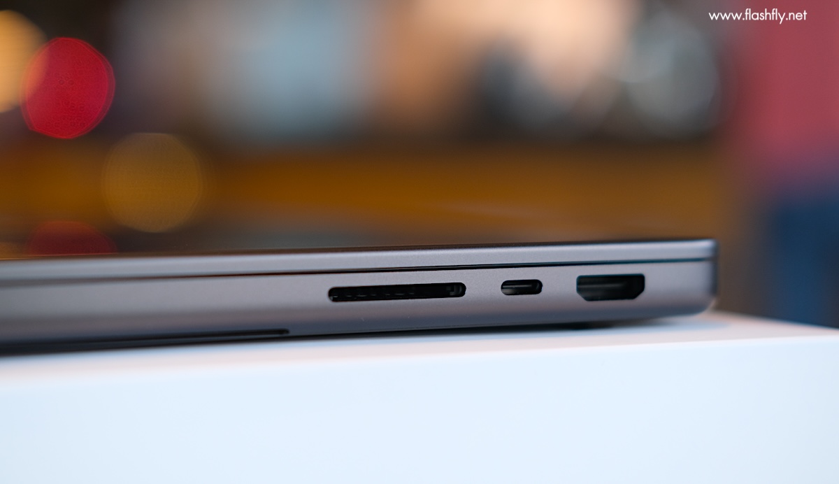 อีกข้างมีพอร์ต HDMI ข้างกันมีพอร์ต Thunderbolt 4 / USB 4 (รวมทั้งหมดมี 3 ช่อง) ตามด้วยช่องอ่านการ์ด SDXC (MacBook Pro รุ่น 14 นิ้ว ชิป M3 จะได้รับ Thunderbolt 3 / USB 4 รวม 2 ช่อง)