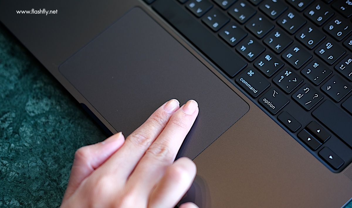 ส่วนแทร็คแพดมีขนาดใหญ่ ช่วยให้ควบคุมเคอร์เซอร์ได้อย่างแม่นยำ และรองรับ Force Touch จึงรับรู้แรงกดในการคลิกลงน้ำหนัก รวมถึงรับรู้การเร่งความเร็วตามแรงกด การวาดนิ้วที่ไวต่อแรงกด และรองรับคำสั่งนิ้ว Multi‑Touch
