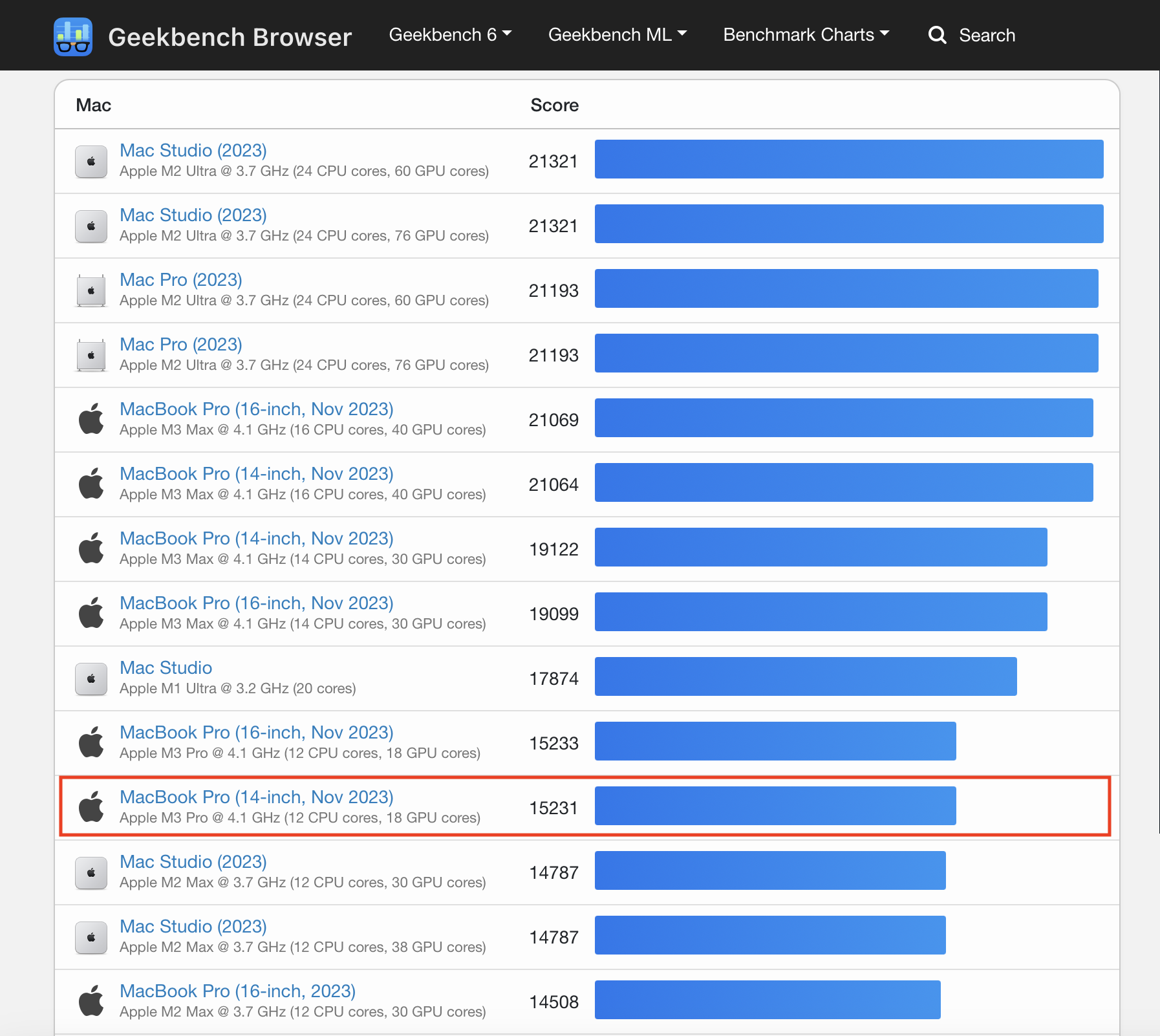 ด้านความจำ MacBook Pro รุ่น 14 นิ้ว ชิป M3 Pro มาพร้อมหน่วยความจำแบบรวมขนาด 18GB (สามารถเพิ่มหน่วยความจำแบบรวมได้สูงสุด 36GB) และตัวจัดเก็บข้อมูลแบบ SSD ความจุ 1TB (สามารถเพิ่มตัวจัดเก็บข้อมูลแบบ SSD ได้สูงสุด 4TB) สามารถทำคะแนนจาก Geekbench แบบ Single-core ได้ 3071 คะแนนและแบบ Multi-Core ได้ 15333 คะแนน แรงกว่าชิป M2 Max ไปเรียบร้อย