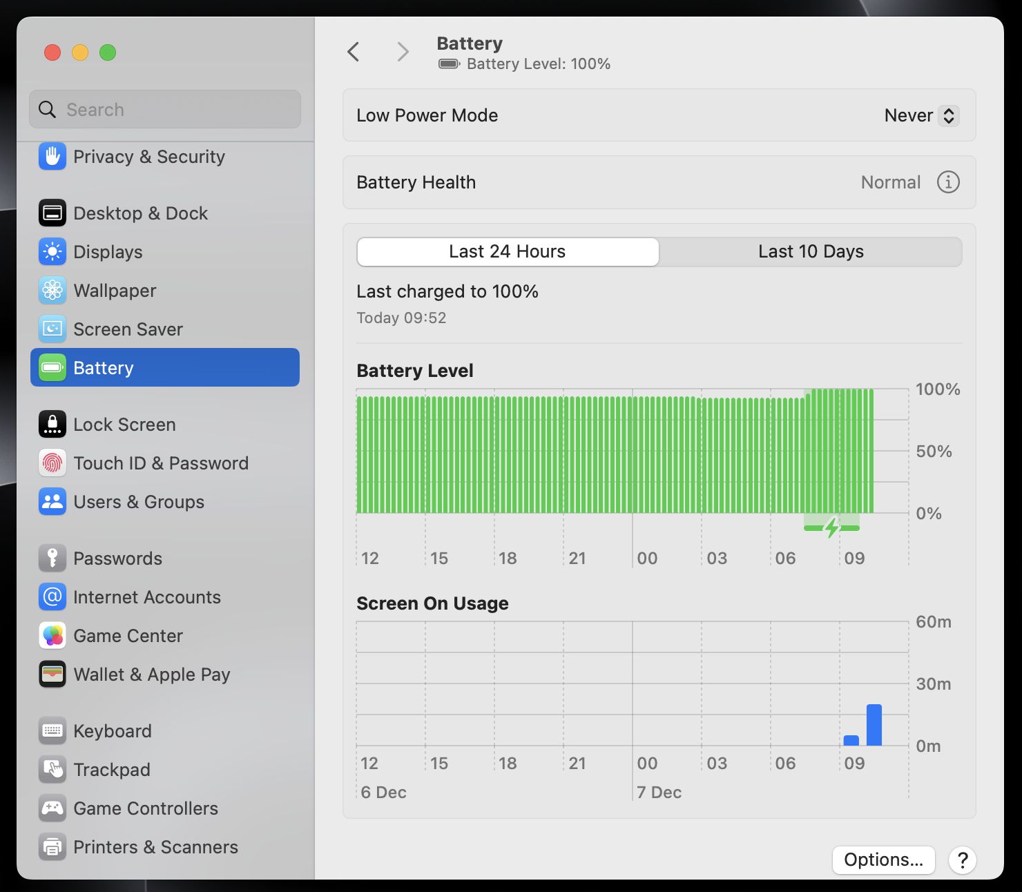 MacBook Pro รุ่น 14 นิ้ว ชิป M3 Pro (CPU แบบ 12‑core) ได้รับแบตเตอรี่ลิเทียมพอลิเมอร์ 72.4 วัตต์-ชั่วโมง ให้อายุการใช้งานยาวนานสูงสุด 18 ชั่วโมง สำหรับการเล่นภาพยนตร์ในแอป Apple TV หรือท่องเว็บผ่านระบบไร้สายนานสูงสุด 12 ชั่วโมง และแถมอะแดปเตอร์แปลงไฟ USB‑C ขนาด 96 วัตต์ มาให้ในกล่อง แต่ MacBook Pro รุ่น 14 นิ้ว ชิป M3 และ M3 Pro (CPU แบบ 11‑core) จะได้รับอะแดปเตอร์แปลงไฟ USB‑C ขนาด 70 วัตต์