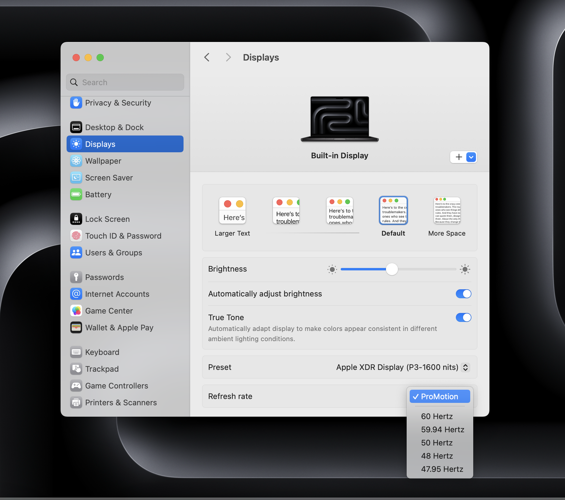 MacBook Pro รุ่น 14 นิ้ว ชิป M3 Pro มาพร้อมจอแสดงผล Liquid Retina XDR ความละเอียด 3024 x 1964 พิกเซล ขนาด 14.2 นิ้ว ความหนาแน่นของพิกเซล 254 พิกเซลต่อนิ้ว รองรับเทคโนโลยี ProMotion ที่มีอัตรารีเฟรชแบบปรับได้สูงสุดที่ 120Hz หรือปรับอัตรารีเฟรชได้ตามต้องการแบบคงที่ 47.95Hz, 48.00Hz, 50.00Hz, 59.94Hz, 60.00Hz