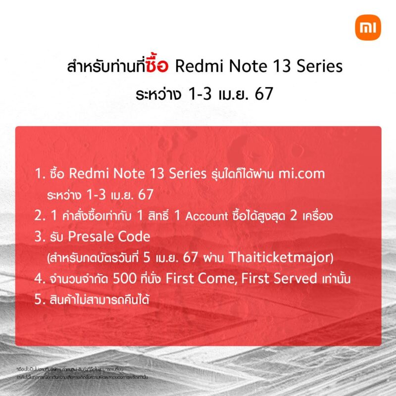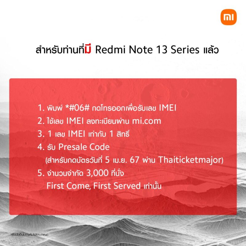 เสียวหมี่ ประเทศไทย มอบสิทธิพิเศษให้กับลูกค้า Redmi Note 13 Series ให้คุณรับสิทธิ์กดซื้อบัตรคอนเสิร์ต ‘2023-2024 BamBam THE 1ST WORLD TOUR ENCORE [AREA 52] in BANGKOK Presented by Xiaomi’ รอบ presale ในวันที่ 5 เมษายน 2567 โดยลูกค้าที่เป็นเจ้าของ Redmi Note 13 Series อยู่แล้วในปัจจุบัน (ก่อนวันที่ 1 เมษายน 2567) สามารถนำเลขเครื่อง IMEI ของ Redmi Note 13 Series ของท่านมาลงทะเบียนผ่าน mi.com ในระหว่างวันที่ 28-31 มีนาคม 2567 เท่านั้น* เพื่อรับ QR Code สำหรับกดซื้อบัตรรอบ Presale และสำหรับลูกค้าใหม่ที่ซื้อ Redmi Note 13 Series ผ่านช่องทาง mi.com ในระหว่างวันที่ 1-3 เมษายน 2567** ก็จะได้รับ QR Code สำหรับกดซื้อบัตรรอบ presale ด้วยเช่นกัน