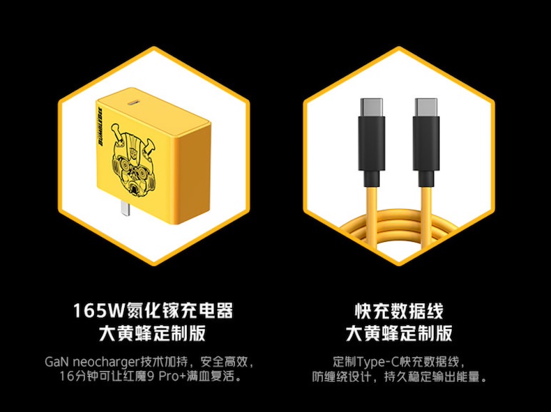 RedMagic 9 Pro+ Bumblebee Edition มีตัวเครื่องสีเหลืองตามเอกลักษณ์ของ Bumblebee ติดโลโก้ Autobot ที่ด้านหลัง จัดส่งมาในกล่องดีไซน์พิเศษ ซึ่งมีอุปกรณ์เสริมที่หาได้เฉพาะ Bumblebee Edition เท่านั้น ไม่ว่าจะเป็นเคส, เข็มช่วยถอดช่องใส่ซิมการ์ดมีโลโก้ Autobot, สายเคเบิลเส้นสีเหลือง, หัวชาร์จ 165W มีรูปใบหน้า Bumblebee และยังแถมพัดลมช่วยระบายความร้อนที่มีโลโก้ Autobot