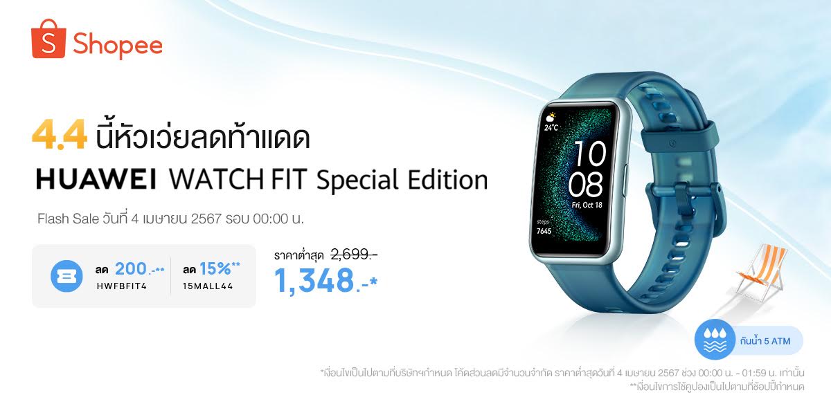 โปรลดแรงท้าแดดที่ Shopee : HUAWEI WATCH FIT Special Edition ราคาต่ำสุด 1,348 บาท[1] จากราคาปกติ 2,699 บาท เมื่อใช้ร่วมกับราคาพิเศษบน Flash Sale รอบ 00:00 น. เหลือเพียง 1,785 บาท และใช้โค้ดจากหัวเว่ย ลดเพิ่ม 200 บาท พิมพ์ HWFBFIT4 และใช้โค้ดจาก Shopee ลดเพิ่ม 15% สูงสุด 2,000 บาท ไม่มีขั้นต่ำ พิมพ์ 15MALL44 นอกจากนี้ยังรับฟรี! กระเป๋าผ้า มูลค่า 790 บาท สำหรับ 80 ออเดอร์แรก ที่ร้านค้าอย่างเป็นทางการของหัวเว่ยบน Shopee ในวันที่ 4 เมษายน 2567 นี้เท่านั้น