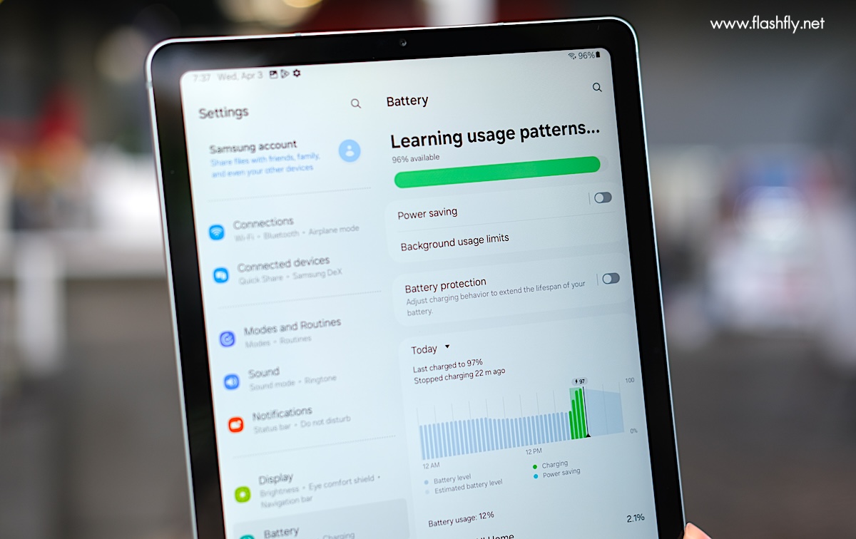 ตัวเครื่อง Samsung Galaxy Tab S6 Lite 2024 มีดีไซน์ที่บางเฉียบน้ำหนักเบา มาพร้อมแบตเตอรี่ความจุ 7040mAh สามารถเล่นวิดีโอได้ยาวนานต่อเนื่องถึง 14 ชั่วโมง จึงสามารถใช้งานทั่วไปได้ตลอดทั้งวัน หมดห่วงไม่ต้องกลัวแบตเตอรี่จะหมดระหว่างวันไปได้เลย และรองรับการชาร์จสูงสุด 15W ผ่านพอร์ต USB Type-C