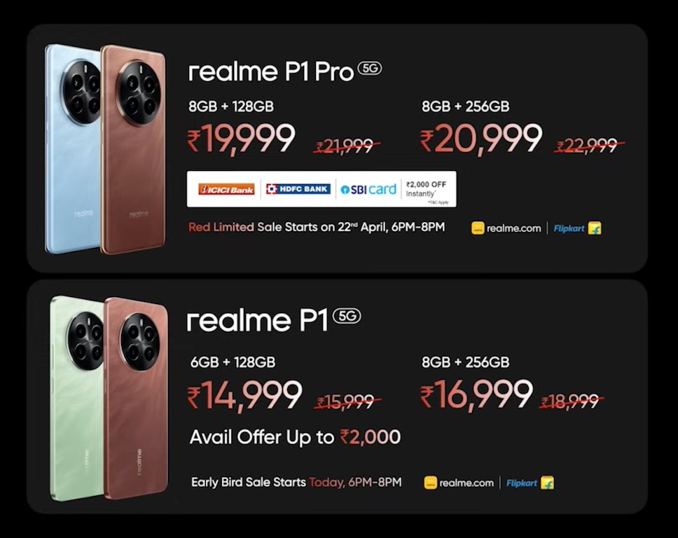 realme P1 5G มาพร้อมจอแสดงผล AMOLED ความสว่าง 2000 นิต ให้อัตราการรีเฟรชสูงสุด 120Hz ใช้ชิปประมวลผล MediaTek Dimensity 7050 มีระบบระบายความร้อน 7-Layer Vapor Chamber Cooling ขนาด 4,356.62 ตารางมิลลิเมตร รองรับชาร์จเร็ว 45W และป้องกันน้ำในระดับ IP54 มาในราคาเริ่มต้น 15,999 รูปี แต่ในช่วงแนะนำลดเหลือ 14,999 รูปี หรือราว 6,690 บาท