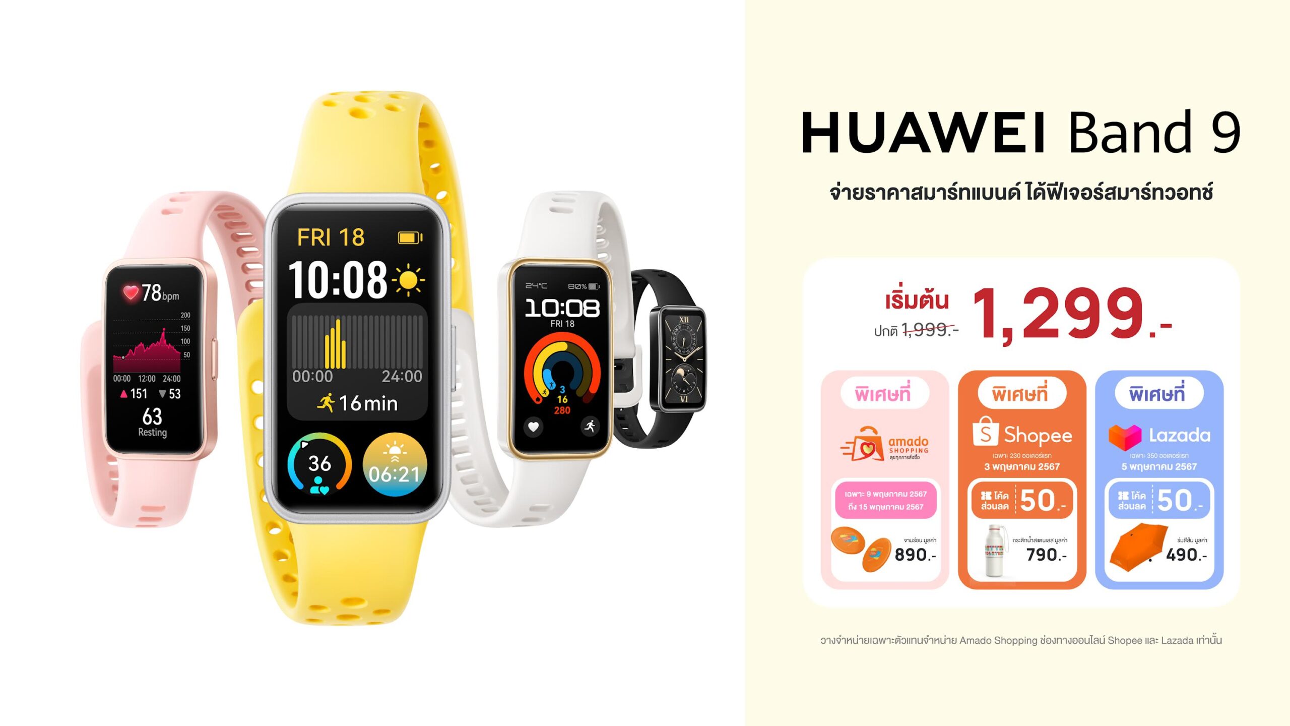 กดใส่ตระกร้ารอได้เลยกับ HUAWEI Band 9 ในราคาเริ่มต้นเพียง 1,299 บาท จากราคาปกติ 1,999 บาท