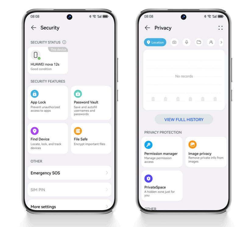 HUAWEI nova 12 Series นำเสนอการจัดการความปลอดภัยและความเป็นส่วนตัวที่ได้รับการปรับปรุง เพิ่มขีดความสามารถของผู้ใช้ในการจัดการและควบคุมความในจุดสำคัญ เช่น การติดตั้งและการทำงานของแอปพลิเคชัน จัดเก็บและจัดการข้อมูลส่วนบุคคลของตน การจัดการการติดตามแอปพลิเคชันได้รับการอัปเกรดเพื่อป้องกันไม่ให้ผู้ใช้ถูกติดตามได้ดียิ่งขึ้น