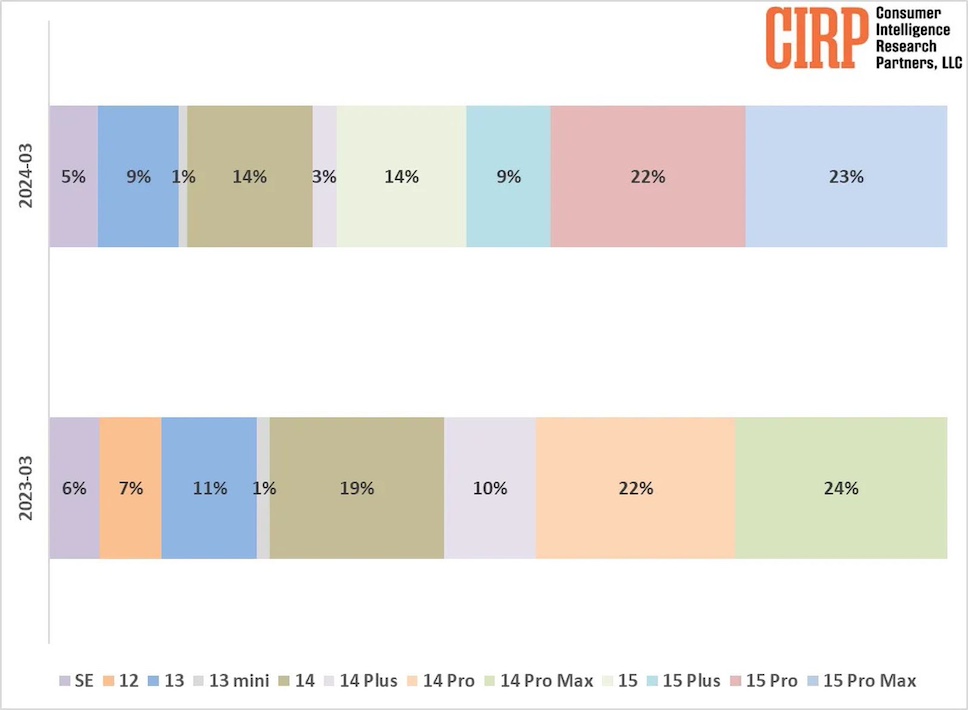 ข้อมูลล่าสุดในช่วงไตรมาสแรกของปีนี้จาก CIRP (Consumer Intelligence Research Partners) พบว่า iPhone 15 Pro Max และ iPhone 15 Pro เป็นสมาร์ทโฟนที่มีผู้ซื้อมากที่สุดในสหรัฐอเมริกา คิดเป็นส่วนแบ่ง 23% และ 22% ของ iPhone ทั้งหมดที่ขายในไตรมาสที่ 1 ปี 2024 โดยมีส่วนแบ่งรวมกัน 45%