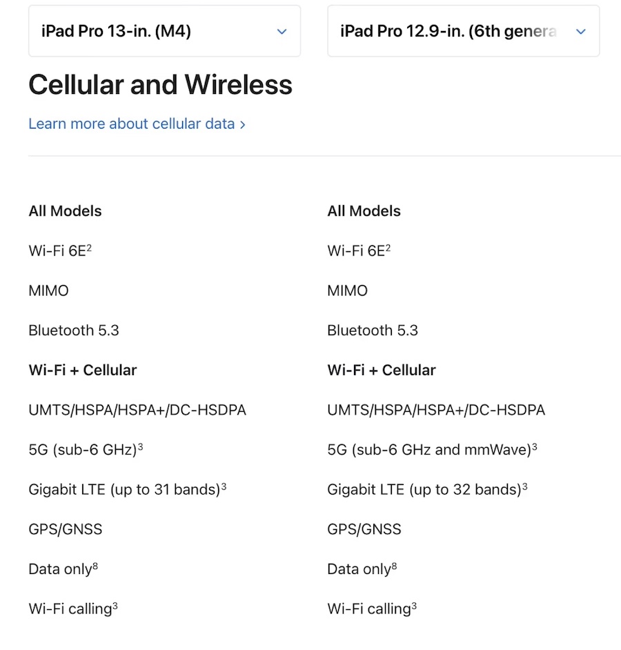 iPad Pro รุ่นชิป M4 เวอร์ชัน Wi‑Fi + Cellular รองรับ 5G sub-6 GHz เท่านั้น ไม่สนับสนุน mmWave ขณะที่ย่านความถี่ Gigabit LTE ก็ลดลงจาก 32 แบนด์ หรือ 31 แบนด์