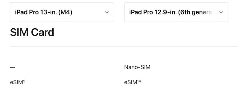 iPad Pro รุ่นชิป M4 ไม่มีถาดใส่ซิมการ์ดในเวอร์ชัน Wi‑Fi + Cellular รองรับเฉพาะ eSIM ขณะที่รุ่นก่อน รองรับทั้ง eSIM และ Nano-SIM