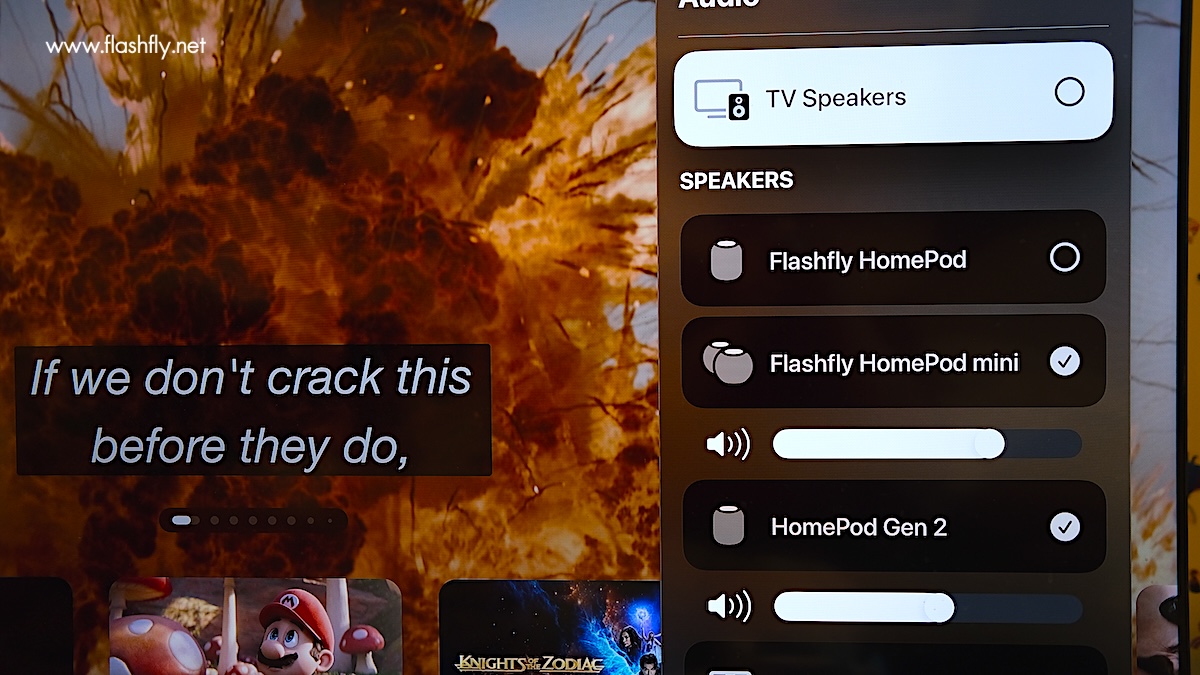 HomePod ยังสามารถสร้างประสบการณ์โฮมเธียร์เตอร์แบบสมจริงได้อย่างง่ายดาย เมื่อเชื่อมต่อกับ Apple TV 4K (รุ่นที่ 2) หรือใหม่กว่า พร้อมรองรับ eARC (Enhanced Audio Return Channel) เพื่อใช้เป็นระบบเสียงสำหรับอุปกรณ์ทุกเครื่องที่เชื่อมต่ออยู่กับทีวี และด้วย Siri ผู้ใช้งานจึงสามารถควบคุมสิ่งที่กำลังเล่นอยู่บน Apple TV ได้แบบไม่ต้องสัมผัสหรือกดปุ่มใดๆ เลย
