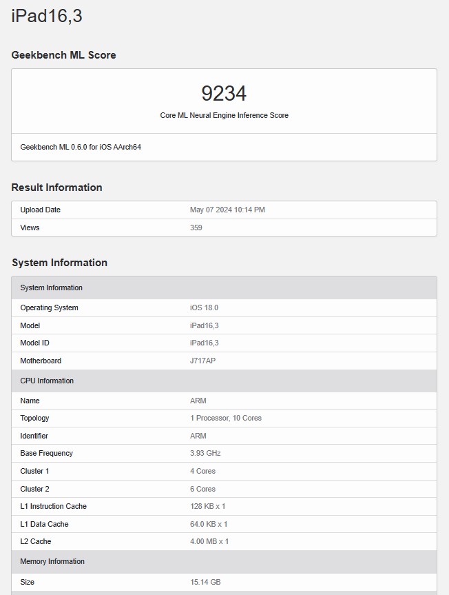 พบ iPad Pro รุ่นใหม่ล่าสุด ที่ใช้ชื่อรหัส iPad16,3 ได้รับการทดสอบประสิทธิภาพบนแอปพลิเคชั่น Geekbench 6 แต่น่าเสียดายที่เป็นการทดสอบประสิทธิภาพด้าน Machine Learning ของชิปเซ็ต จึงไม่สามารถนำไปเปรียบเทียบประสิทธิภาพด้าน single-core และ multi-core กับชิปรุ่นก่อนได้