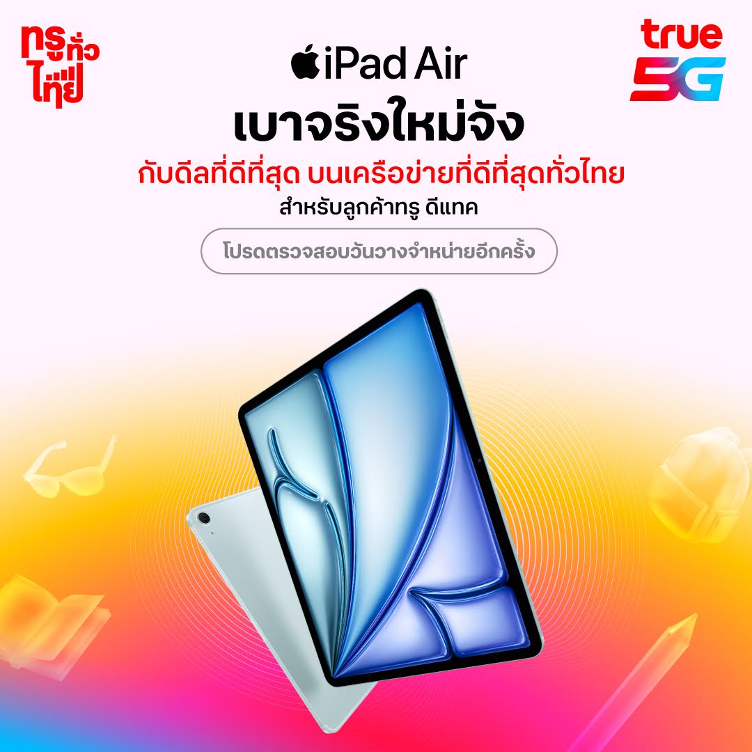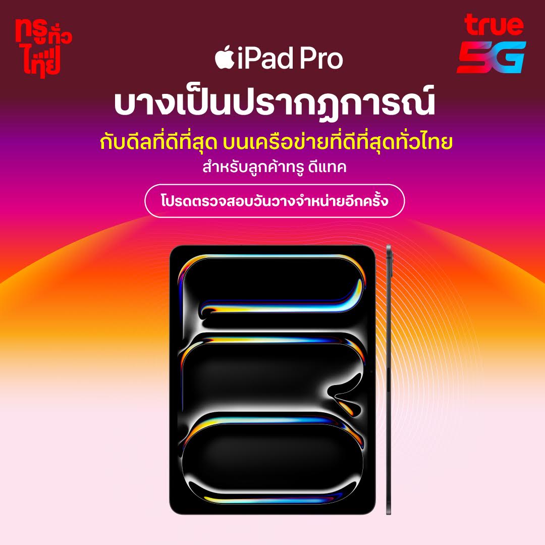 ทรู 5G เตรียมวางจำหน่าย iPad Pro รุ่นใหม่ที่มีดีไซน์ที่บางเบาเป็นปรากฎการณ์และดีไซน์สวยสะดุดตา พร้อมด้วยหน้าจอสุดล้ำ Ultra Retina XDR และชิป M4 ที่ทรงพลังและมีความเร็วที่สูงสุด พร้อมสำหรับ AI รวมไปถึง iPad Air ทั้งในรุ่น 11 นิ้ว และ 13 นิ้ว แบบใหม่หมด สุดยอดประสิทธิภาพที่อัดฉีดพลังแรงโดยชิป M2 เตรียมเป็นเจ้าของเร็วๆนี้ บนเครือข่ายที่ดีที่สุดทั่วไทย ดูรายละเอียดเพิ่มเติม iPad Pro ที่ https://www.true.th/apple/ipad-pro-m4/index.html และ iPad Air ที่ https://www.true.th/apple/ipad-air-m2/index.html