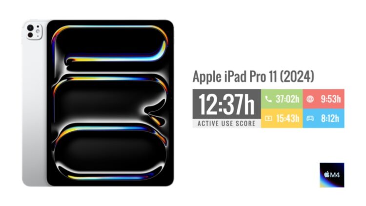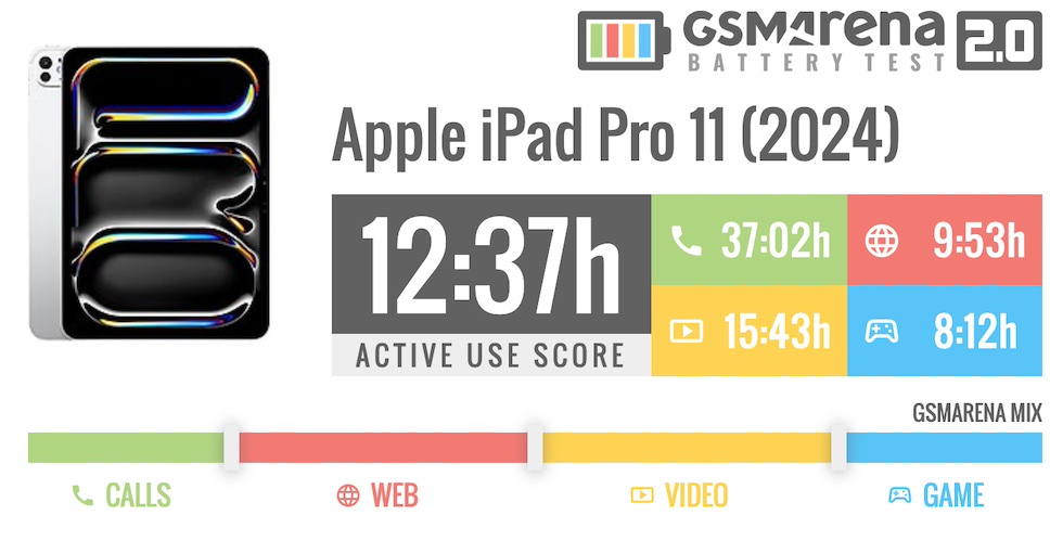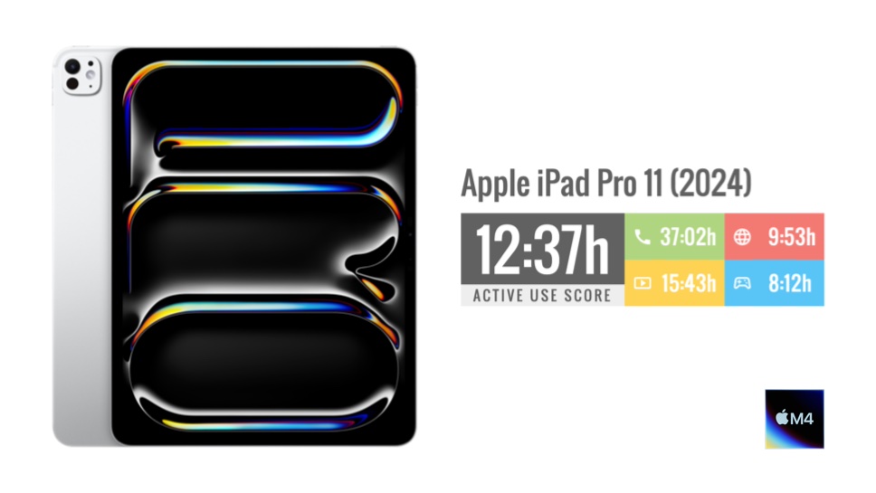 Apple ระบุว่า iPad Pro รุ่นชิป M4 ทั้งขนาด 11 และ 13 นิ้ว สามารถท่องเว็บผ่าน Wi-Fi หรือดูวิดีโอได้นานสูงสุด 10 ชั่วโมง แต่จากการทดสอบแบตเตอรี่ของ Gsmarena พบว่าให้อายุการใช้งานที่ดีกว่ามาก