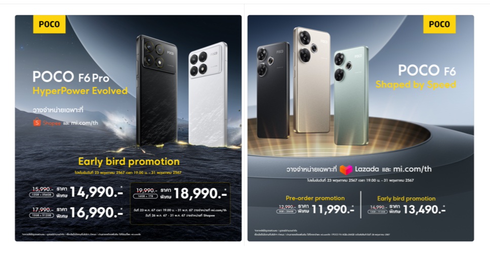 POCO เปิดรับจองสมาร์ทโฟน POCO F6 และ F6 Pro ในไทยแล้ววันนี้ ไปจนถึงวันที่ 31 พฤษภาคม 2567 ผ่านร้านค้าออนไลน์บนแพลตฟอร์ม Shopee, Lazada และเว็บไซต์ทางการของ Xiaomi เริ่มจัดส่งตั้งแต่วันที่ 28 พฤษภาคม 2567 เป็นต้นไป