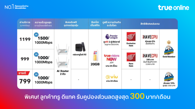 ตอกย้ำผู้นำตลาดเกมมิ่ง ทรูพร้อมระเบิดความมันส์ให้กับเกมเมอร์สุดกว่าที่เคย!…เปิดแพ็กเกจรายเดือน 5G Super Gamer ครั้งแรกของไทยเหนือกว่าใครทุกคน เปิด “เน็ตเลนพิเศษ” ให้คอเกม ตัวจริงเล่นเกม ได้ลื่นไหล ปิงต่ำ ไม่แลค ตึงสุด! ลุยได้ทุกเกม ทั้งเก็บเวล ลงดัน ปั๊มแรงค์ รับฟรีเน็ตเล่น 11 เกมฮิต ทั้ง PUBG Mobile, RoV, Call of Duty: Mobile, Free Fire, Speed Drifters, Arena Breakout, Ragnarok Origin, Nice to Z You, OCTOPATH TRAVELER: CotC, Black Clover M และ Moonlight Blade พร้อมท่องฟรี 3 แอปสตรีมและ โซเชียล อย่าง Afreeca TV, YouTube และ TikTok รวมถึงส่วนลดเติมเกม และไอเทมพิเศษจาก PUBG MOBILE ทุกเดือน เริ่มต้นเพียง 499 บาทต่อเดือน เพียงเปิดเบอร์ใหม่ ย้ายค่ายเบอร์เดิม หรือเปลี่ยนจากเติมเงินเป็นรายเดือน พร้อมเอาใจเกมเมอร์สายฮาร์ดคอร์ ด้วยเน็ตบ้าน อันดับ 1 ทรูออนไลน์ แพ็กเกจ PRO AI อัจฉริยะล้ำสุดด้วย SMART AI แรงกว่าใครด้วย fastlane ใช้ AI วิเคราะห์ให้ตรงกับไลฟ์สไตล์ ได้ด้วยเน็ตแรงแบบ VIP จะแคสต์ เล่นเกม หรือประชุมออนไลน์ ก็ลื่นไหล ได้อย่างโปร พร้อมรับสิทธิพิเศษมากมายเพื่อเกมเมอร์สายฮาร์ดคอร์ เริ่มต้นเพียง 799 บาทต่อเดือน สมัครเลยที่เว็บไซต์ หรือที่ทรูช็อปและดีแทคช็อปทุกสาขา ตั้งแต่วันนี้ เป็นต้นไป
