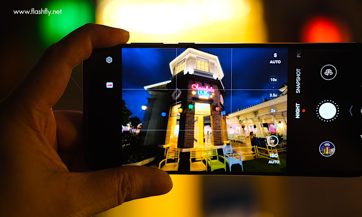 โหมด Night สำหรับการถ่ายภาพในสภาวะแสงน้อยหรือในเวลากลางคืน มาพร้อมเครื่องมือปรับความไวแสง ISO และความเร็วชัตเตอร์ รองรับการซูมตั้งแต่ระยะ Wide ซึ่งเป็นการเปิดใช้งานกล้อง Ultra-Wide จากนั้นสามารถเลื่อนเพื่อซูมได้สูงสุด 100 เท่า แต่การซูมแบบออปติคัลจะสูงสุดที่ 3.5 เท่า