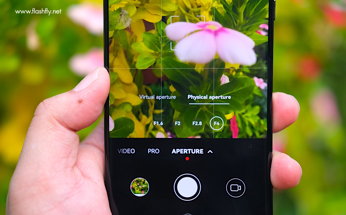 โหมด Aperture สามารถปรับรูรับแสง หรือ ค่า F ได้ 2 แบบ ได้แก่ Virtual Aperture ปรับได้ตั้งแต่ F0.95 จนสูงสุด F16 ขณะที่ Physical Aperture จะเป็นการปรับด้วยฮาร์ดแวร์กล้องแบบยืดหดได้ ในช่วง F1.6 / F2.0 / F2.8 / F4.0 และรองรับการซูมที่ระยะ 1 / 2 / 3.5 เท่า
