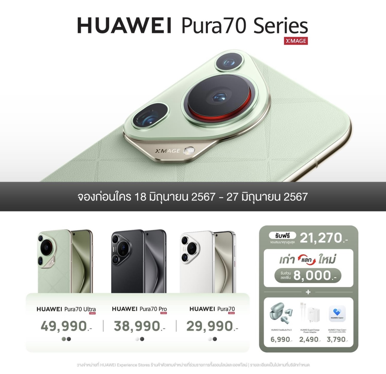 - HUAWEI Pura 70 Ultra มี 2 สีให้เลือกคือสีเขียวและสีดำ แรม 16GB ความจุ 512GB ราคา 49,990 บาท รับของแถม