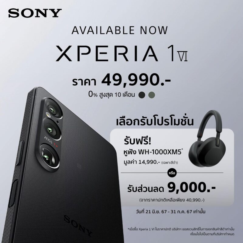 Xperia™ 1 VI มีให้เลือก 2 สี คือ สีดำ (Black) และสีเขียวกากี (Khaki Green) จะเริ่มวางจำหน่ายตั้งแต่วันที่ 21 มิถุนายน ศกนี้ เป็นต้นไป ในราคา 49,990 บาท พร้อมรับข้อเสนอสุดพิเศษ เมื่อซื้อ Xperia™ 1 VI ตั้งแต่วันที่ 21 มิถุนายน ถึง 31 กรกฎาคม 2567 เลือกรับส่วนลดเงินสดทันที 9,000 บาท (ราคาสุทธิ 40,990 บาท) หรือเลือกรับฟรีหูฟัง Wireless Noise Cancelling Headphone รุ่น WH-1000XM5 สีดำ มูลค่า 14,990 บาท เมื่อซื้อสินค้าในราคาปกติ 49,990 บาท ผู้สนใจสามารถทดลองประสิทธิภาพและหาซื้อ Xperia™ 1 VI ได้ที่ร้านค้าที่ร่วมรายการดังนี้