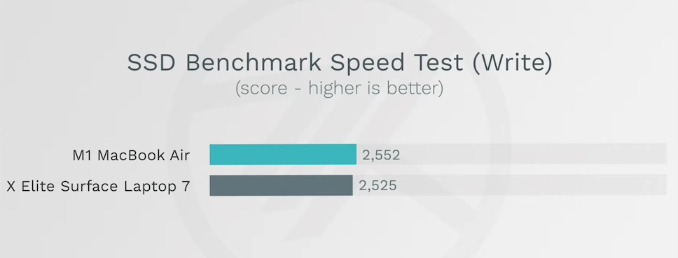 การทดสอบประสิทธิภาพระหว่าง Surface Laptop 7 กับ MacBook Air รุ่นชิป M1 เริ่มต้นด้วยความเร็วของ SSD โดย MacBook Air ที่ Max Tech นำมาทดสอบมีขนาด 256GB ขณะที่ Surface Laptop 7 มีขนาด 512GB และผลทดสอบพบว่า Surface Laptop 7 ทำความเร็วในการอ่านได้ดีกว่า แต่ MacBook Air M1 ทำความเร็วในการเขียนเหนือกว่าเล็กน้อย