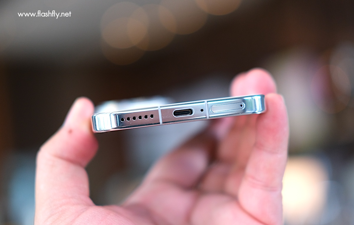 ด้านล่างมีลำโพง, พอร์ตเชื่อมต่อ USB Type-C (USB 3.1 GEN1), ไมโครโฟนตัวหลัก และ ถาดใส่ซิมการ์ด (Dual Nano-SIM) นอกจากดีไซน์สวยงามพรีเมียม HUAWEI Pura 70 ยังได้รับการออกแบบมาให้ป้องกันน้ําและฝุ่นในระดับ IP68 ภายใต้มาตรฐาน IEC 60529