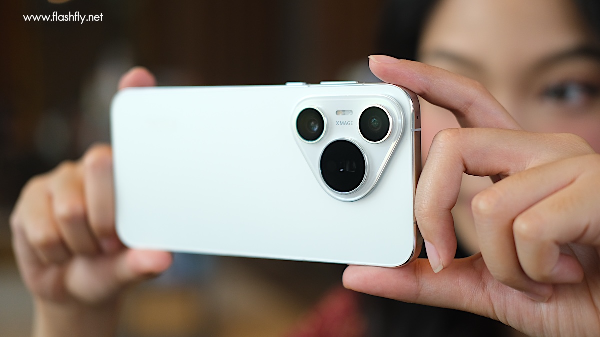ด้านหลังมีให้เลือก 2 สี ได้แก่ สีดำ และอย่างที่เห็น ทีมงาน @Flashfly ได้รับสีขาวมารีวิว โดดเด่นที่กล้องหลัง 3 ตัว จัดวางในกรอบรูปสามเหลี่ยม พร้อมโลโก้แบรนด์ XMAGE และแฟลช LED