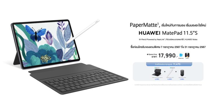 HUAWEI MatePad 11.5″S วางขายแล้ววันนี้ในราคา 17,990 บาท สำหรับลูกค้าที่สั่งซื้อก่อนใครตั้งแต่วันที่ 7 กรกฎาคม 2567 – 31 กรกฎาคม 2567 รับของแถมพิเศษ ได้แก่ ปากกา HUAWEI-M Pencil รุ่นที่ 3 มูลค่า 4,990 บาท เคสคีย์บอร์ด HUAWEI Smart Keyboard มูลค่า 4,990 บาท และ HUAWEI Wireless Mouse มูลค่า 1,490 บาท ที่หน้าร้าน HUAWEI Experience Store และ ร้านค้าตัวแทนจำหน่ายที่ร่วมรายการ รวมถึงร้านค้าอย่างเป็นทางการของหัวเว่ยบน Lazada, Shopee และ TikTok