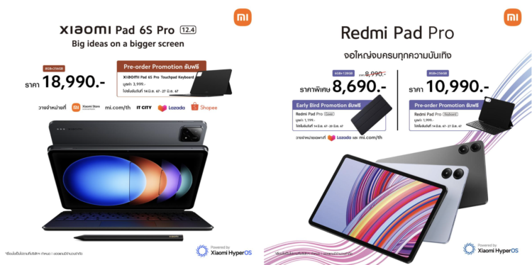 - Redmi Pad Pro รุ่นความจุ 6GB+128GB วางจำหน่ายในราคา 8,990 บาท เฉพาะที่ mi.com/th และ Lazada พิเศษ! สำหรับลูกค้าที่สั่งซื้อในระหว่างวันที่ 14-20 มิถุนายน 2567 สามารถซื้อสินค้าในราคาพิเศษเพียง 8,690 บาท พร้อมรับฟรี Redmi Pad Pro Cover มูลค่า 1,199 บาท12