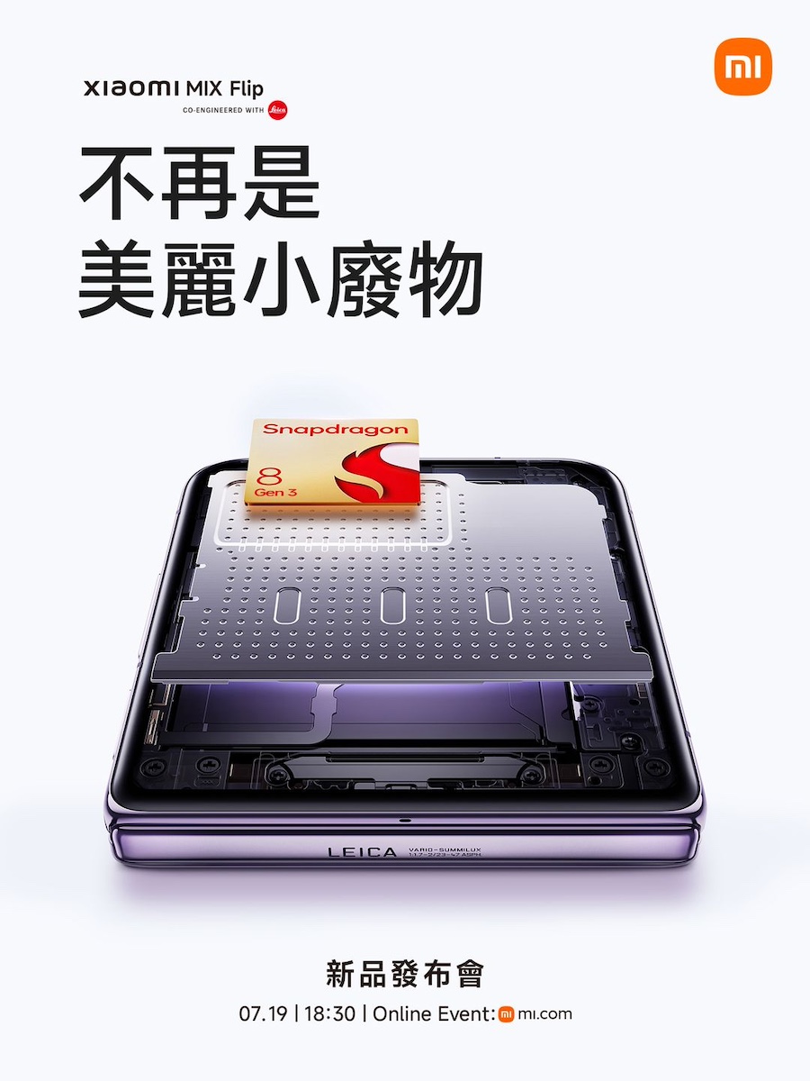Xiaomi Mix Flip ได้รับการยืนยันว่า จะมาพร้อมจอแสดงผลด้านนอกขนาดใหญ่ 4.01 นิ้ว ความละเอียด 1.5K ความสว่างสูงสุด 1600 นิต กล้องระดับเรือธง ใช้เลนส์ Leica Summilux ที่มีรูรับแสงขนาดใหญ่ ขับเคลื่อนด้วยโปรเซสเซอร์ Snapdragon 8 Gen 3 มีระบบระบายความร้อน 3D Vapor Chamber ความจำ RAM LPDDR5X จับคู่กับ ROM UFS 4.0 แบตเตอรี่ขนาด 4780mAh