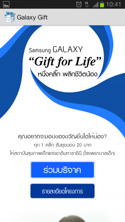 การกดโหวต 1 ครั้งผ่านทางแอพพลิเคชัน “Galaxy Gift” จะมีค่าเท่ากับจำนวนเงินที่ซัมซุงจะมอบให้โรงพยาบาลเด็ก 20 บาท ทั้งยังสามารถกดแชร์ต่อให้เพื่อนๆ ได้ เพื่อเพิ่มมูลค่าการให้เป็น 2 เท่าอีกด้วย