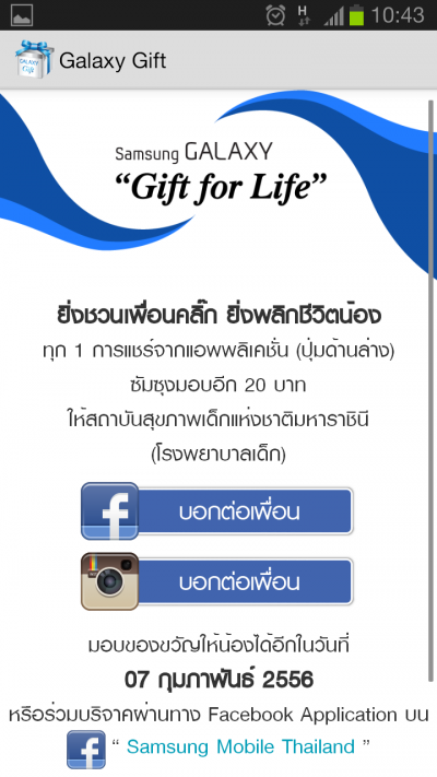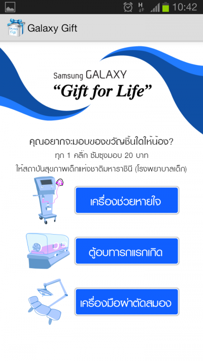 ซัมซุงเปิดตัวโครงการ “ซัมซุง กาแล็คซี่ กิฟท์ ฟอร์ ไลฟ์” เชิญชวน ชาวไทยทำความดีผ่านแอพ ง่ายๆ เพียงแค่คลิก ก็สามารถร่วมมอบอุปกรณ์ทางการแพทย์ที่ขาดแคลนสูงสุด 3 อันดับ ได้แก่ 1.ตู้อบพร้อมอุปกรณ์ช่วยชีวิตทารกแรกเกิด 2.เครื่องช่วยหายใจ และ 3.เครื่องมือผ่าตัดสมอง ให้แก่สถาบันสุขภาพเด็กแห่งชาติมหาราชินี (โรงพยาบาลเด็ก) โดยไม่เสียค่าใช้จ่ายใดๆ เป็นการทำความดีแบบง่ายๆ ที่ทำได้ทุกที่ทุกเวลา