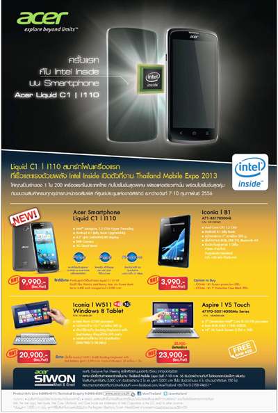 – Acer Liquid C1 สมาร์ทโฟนพลัง Intel® AtomTM processor Z2420 เครื่องแรกของโลก ความเร็ว 1.2 GHz Hyper Threading ที่ให้ความเร็ว แรง ในการเข้าถึงแอพ แชท แชร์ได้เร็วกว่าที่เคย หน้าจอ LCD Touch 4.3 นิ้ว IPS ความละเอียด qHD 960×540 พิกเซล ระบบปฏิบัติการแอนดรอยด์ 4.0 (พร้อมอัพเกรดเจลลี่บีนเวอร์ชั่น) หน่วยความจำ ROM 4 GB และ RAM 1GB กล้องหลัง 8 MP AF&LED อิสระในการเชื่อมต่อ 3G ได้ทุกเครือข่ายบนความเร็ว 21 Mbps แบตเตอรี่ 2000 mAh ให้ความต่อเนื่องในการใช้งานได้ถึง 9 ชั่วโมง Acer Liquid C1 ราคาขายเครื่องละ 9,990 บาท (ราคารวมภาษีมูลค่าเพิ่ม) * สิทธิพิเศษสำหรับลูกค้าที่เป็นเจ้าของ Acer Liquid C1 ในงาน Thailand Mobile Expo 2013 รับฟรีทันที ฟิลม์กันรอย, Intel Bunny Man และ พร้อมแบตเตอรี่สำรอง (Power Bank) ขนาด 4,400 mAh รวมมูลค่าก่วา 2,000 บาท และ Kaspersky Mobile Security for Android Full License 6 months.