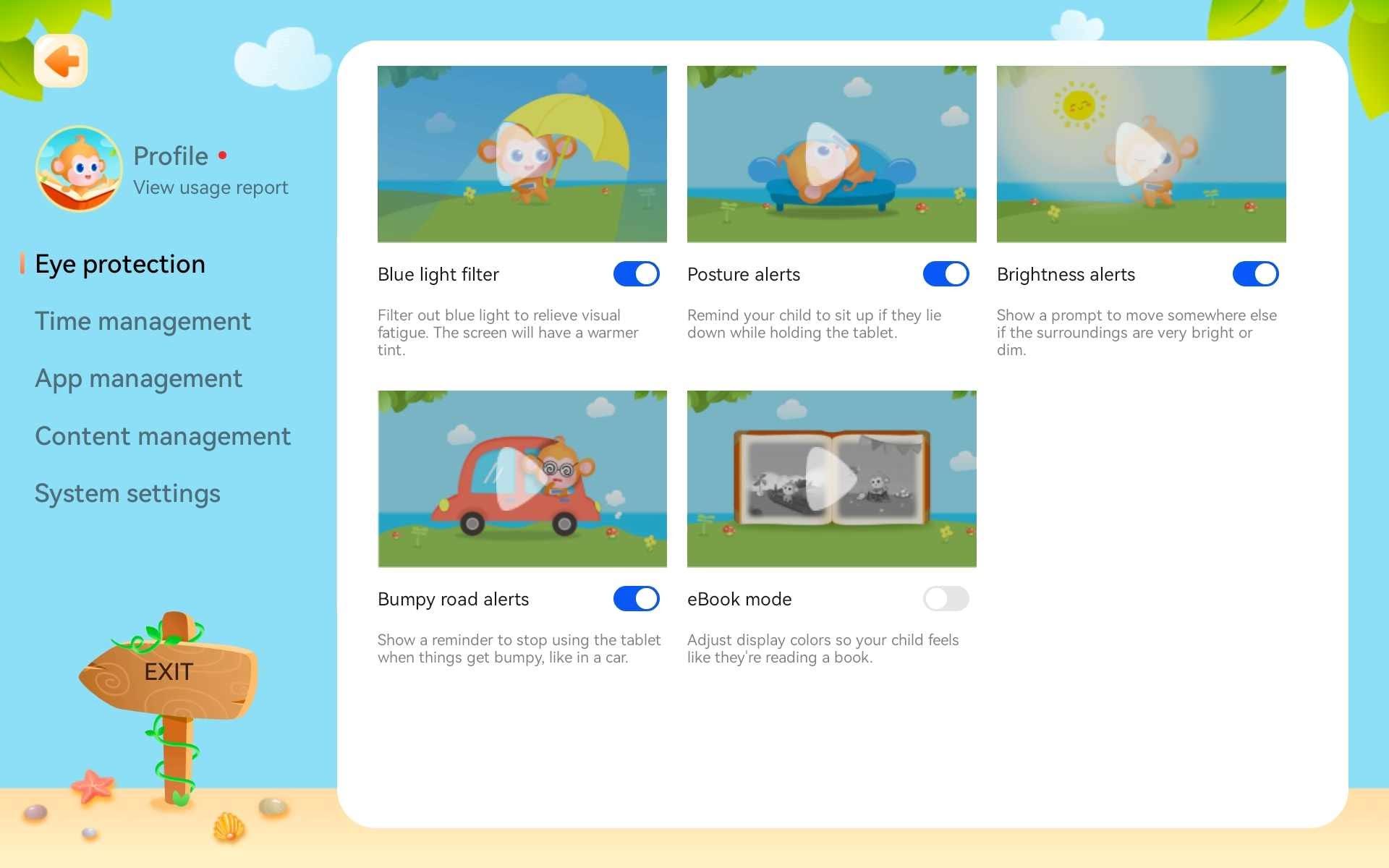 การป้องกันดวงตาแบบหลายชั้น – แจ้งเตือนท่าทางการใช้งาน: ติดตั้ง Gravity Sensor ซึ่งสามารถตรวจจับได้ว่าผู้ใช้กำลังนอนเล่นแท็บเล็ตอยู่หรือไม่ เพื่อส่งสัญญาณแจ้งเตือนให้ปรับท่านั่งให้เหมาะสมระหว่างใช้งาน