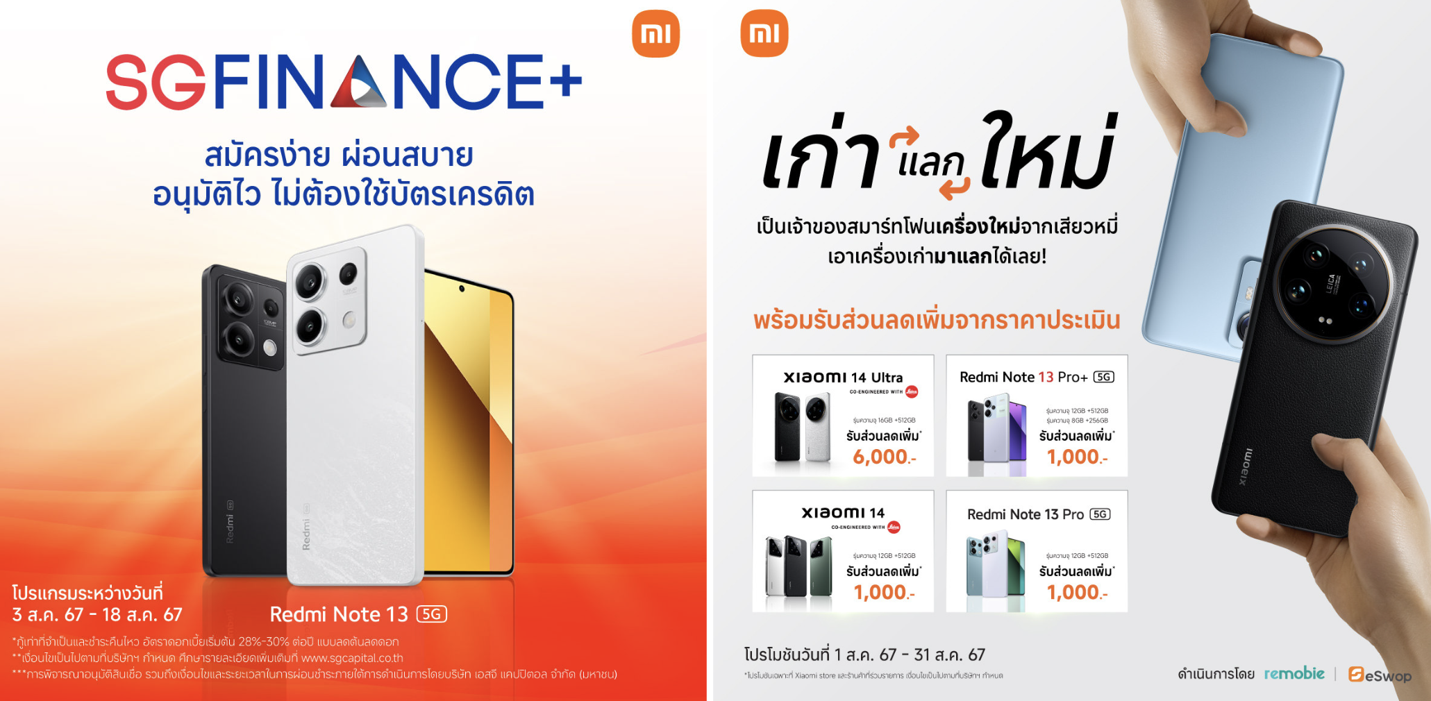 เสียวหมี่ ประเทศไทย ให้คุณเป็นเจ้าของสมาร์ทโฟนรุ่นยอดฮิตอย่าง Redmi Note 13 Series และ Xiaomi 14 Series ได้ง่ายขึ้นด้วยโปรแกรมพิเศษในช่วงเดือนสิงหาคม อาทิ โปรแกรมการผ่อนจาก SG Finance+1 หรือ โปรแกรมการนำเครื่องเก่ามาแลกเครื่องใหม่พร้อมรับส่วนลดเพิ่มเติม3 โดยผู้ที่สนใจสามารถสอบถามข้อมูลเพิ่มเติม ได้ที่ Xiaomi Store และร้านตัวแทนจำหน่ายที่ร่วมรายการ