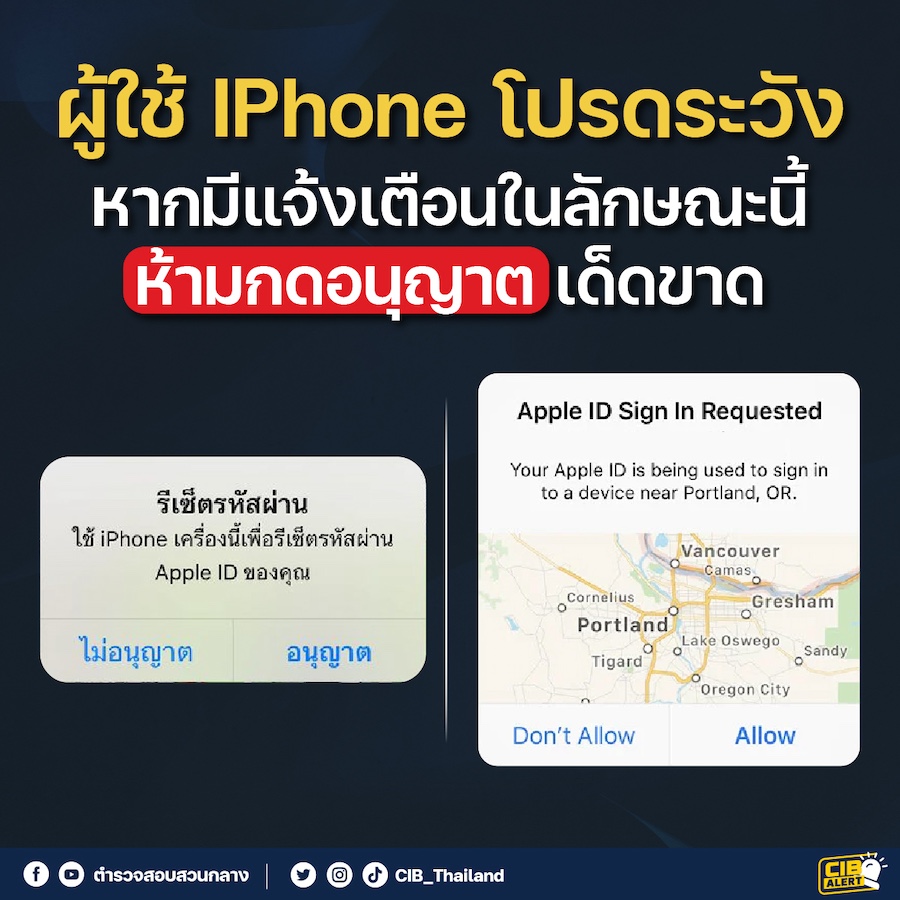 CIB (ตำรวจสอบสวนกลาง) ออกมาเตือนภัยเจ้าของ iPhone หากได้รับการแจ้งเตือนว่า “รีเซ็ตรหัสผ่าน ใช้ iPhone เครื่องนี้เพื่อรีเซ็ทรหัสผ่าน Apple ID” ห้ามกดอนุญาตเด็ดขาด