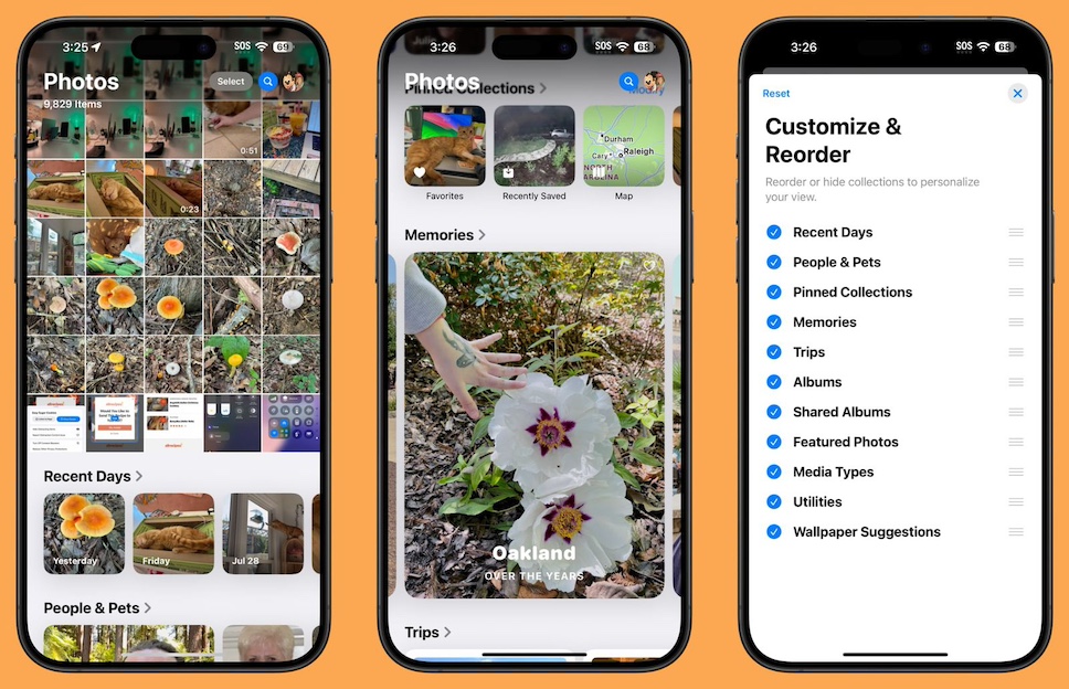 แอป Photos ได้รับการออกแบบ User Interface ใหม่ใน iOS 18 แต่มีเสียงตอบรับในเชิงลบ ทำให้ Apple ต้องปรับปรุงการออกแบบอีกครั้งใน iOS 18.1 โดยลบดีไซน์แบบแถบเลื่อนออกไป เพื่อให้แอปดูสับสนน้อยลง และสามารถเข้าถึง Collections ได้โดยการเลื่อนลงมาจากมุมมองไลบรารีหลักเท่านั้น ขณะที่ Photo Library จะแสดงรูปภาพพร้อมกันมากขึ้นในรูปแบบตาราง และย้ายอัลบัมไปไว้ด้านบนตามค่าเริ่มต้น เพื่อให้ผู้ใช้งานเข้าถึงได้ง่ายขึ้น ส่วนเนื้อหาที่บันทึกล่าสุด จะถูกรวมไว้ใน Recent Days