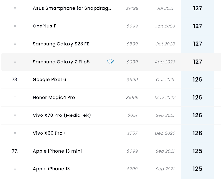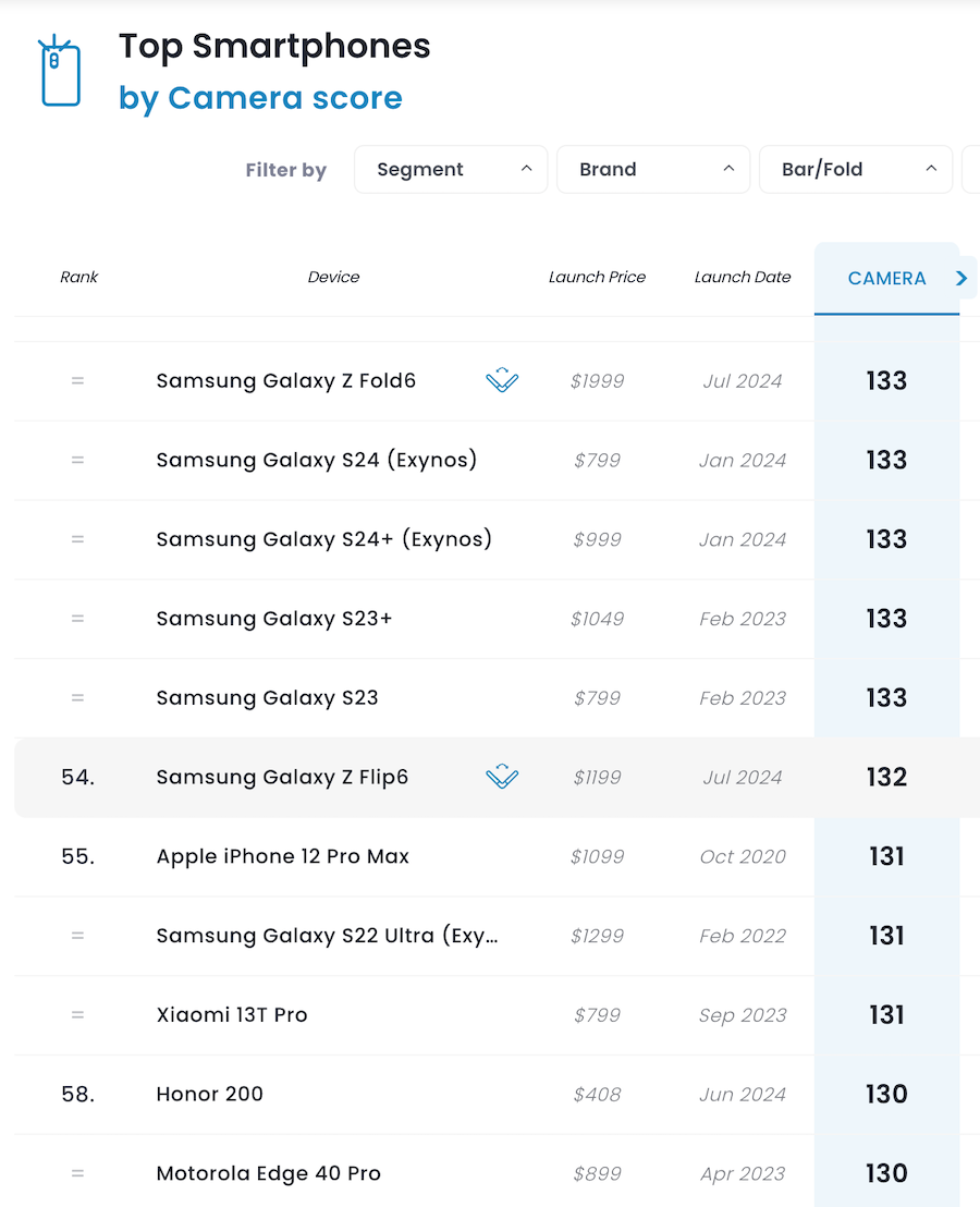 ถึงแม้ Galaxy Z Flip6 จะไม่อยู่ในอันดับต้นๆ ของตาราง แต่ก็ดีพอที่จะอยู่ในตำแหน่งที่เหนือกว่าอดีตเรือธงหลายรุ่น ไม่ว่าจะเป็น iPhone 12 Pro Max, Galaxy S22 Ultra หรือ Huawei P40 Pro