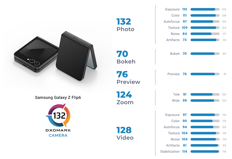 ด้วยการปรับปรุงกล้องหลัก ทำให้ Galaxy Z Flip6 มีคะแนนรวม 132 คะแนน จากการทดสอบของ DXOMARK ขณะที่ Galaxy Z Flip5 เคยทำได้ 127 คะแนน ส่งผลให้ Galaxy Z Flip6 นั่งอยู่ในอันดับที่ 54 ในฐานะสมาร์ทโฟนที่มีกล้องดีที่สุด และอยู่ในอันดับที่ 44 ถ้านับเฉพาะสมาร์ทโฟนระดับพรีเมียม ที่เคยผ่านการทดสอบกล้องจาก DXOMARK