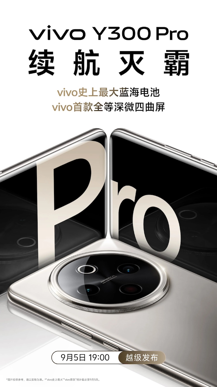 vivo ปล่อยภาพทีเซอร์ออกมาโปรโมทสมาร์ทโฟน vivo Y300 Pro เผยให้เห็นดีไซน์กล้องหลัง และความบาง 7.69 มิลลิเมตร โดยระบุวันที่เปิดตัว 5 กันยายน 2024 เวลา 19.00 น. ตามเวลาท้องถิ่นของประเทศจีน