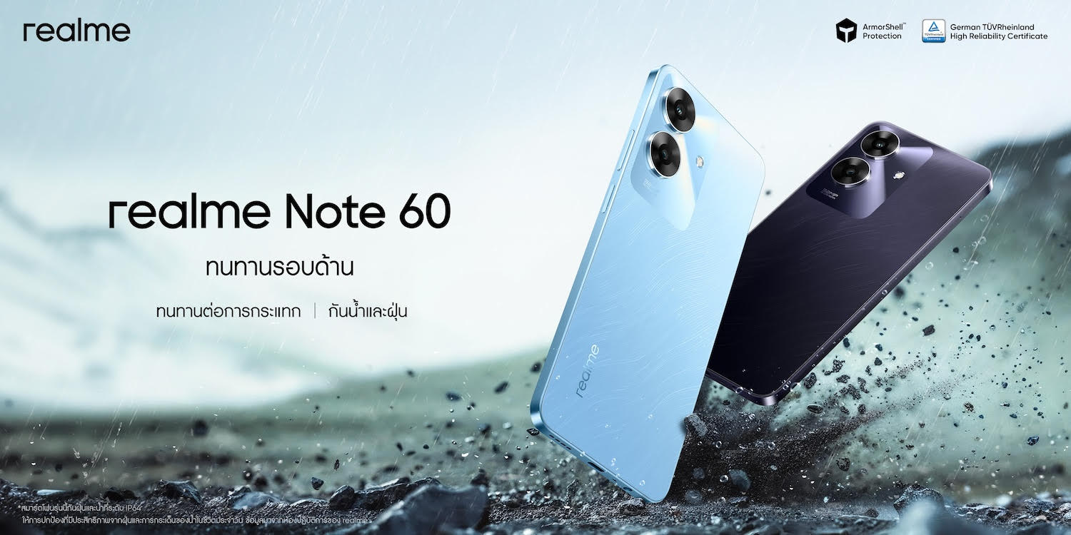 ใครบอกว่ามือถือราคาประหยัดต้องพังง่าย! วันนี้ realme (เรียลมี) แบรนด์สมาร์ตโฟนเพื่อคนรุ่นใหม่ที่เติบโตเร็วที่สุดในโลก จะเปลี่ยนความคิดของคุณด้วยบัดเจ็ตโฟนรุ่นใหม่ในตระกูล NOTE Series ที่ทุกคนจับตามอง กับ “realme Note 60” ชูจุดเด่นเรื่องความแข็งแกร่งจากกลไกการปกป้องสมาร์ตโฟนรอบด้านแบบ 360° ในชื่อ ArmorShell™ Protection ครั้งแรกในสมาร์ตโฟน realme ผ่านการอัปเกรดองค์ประกอบบอดี้ทั้ง 8 ด้าน อาทิ การใช้โครงสร้างอะลูมิเนียมหล่อขึ้นรูปแข็งแกร่งสูง กระจกเสริมแรง ฟิล์มแผงวงจรดูดซับแรงกระแทก ฯลฯ เพื่อสร้างบัดเจ็ตโฟนที่ทนทานต่อการบิดงอ ตกกระแทก รอยขีดข่วน และการใช้งานหนักทุกรูปแบบ แถมมาพร้อมคุณสมบัติ IP64 ที่ช่วยกันน้ำกันฝุ่นจากการใช้งานประจำวันได้อย่างมั่นใจ