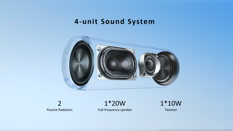เทคโนโลยีการแบ่งความถี่ของ HUAWEI Sound ขับเคลื่อนยูนิตลำโพง 4 ตัว ประกอบด้วย ทวีตเตอร์ 10W 1 ตัว ลำโพงความถี่เต็ม 20 วัตต์ 1 ตัว และพาสซีฟเรดิเอเตอร์ PUSH-PUSH แบบสมมาตร 2 ตัว ให้เสียงเบสที่กระหึ่มต่ำถึง 50 Hz และทวีตเตอร์ก็พุ่งสูงถึง 20 kHz ของเสียงแหลม พาสซีฟเรดิเอเตอร์แบบสมมาตรสั่นด้วยแอมพลิจูดสูงสุด 16 มม. เพื่อให้เสียงดังขึ้นโดยไม่รบกวนส่วนประกอบอื่นๆ
