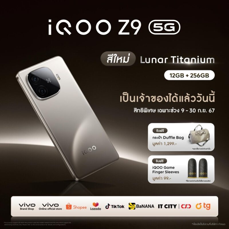 iQOO Z9 5G สีสันใหม่ ‘ลูนาร์ ไทเทเนียม’ (Lunar Titanium) จะวางจำหน่ายอย่างเป็นทางการในประเทศไทยวันที่ 9 กันยายน 2567 ในราคา 12,499 บาท สำหรับรุ่นความจุ 12GB+256GB ผู้ที่สนใจสามารถลงทะเบียนเพื่อจับจองเป็นเจ้าของได้ตั้งแต่วันที่ 9 – 30 กันยายนนี้ พร้อมรับของสมนาคุณสุดพิเศษมูลค่ารวม 1,398 บาท ได้แก่